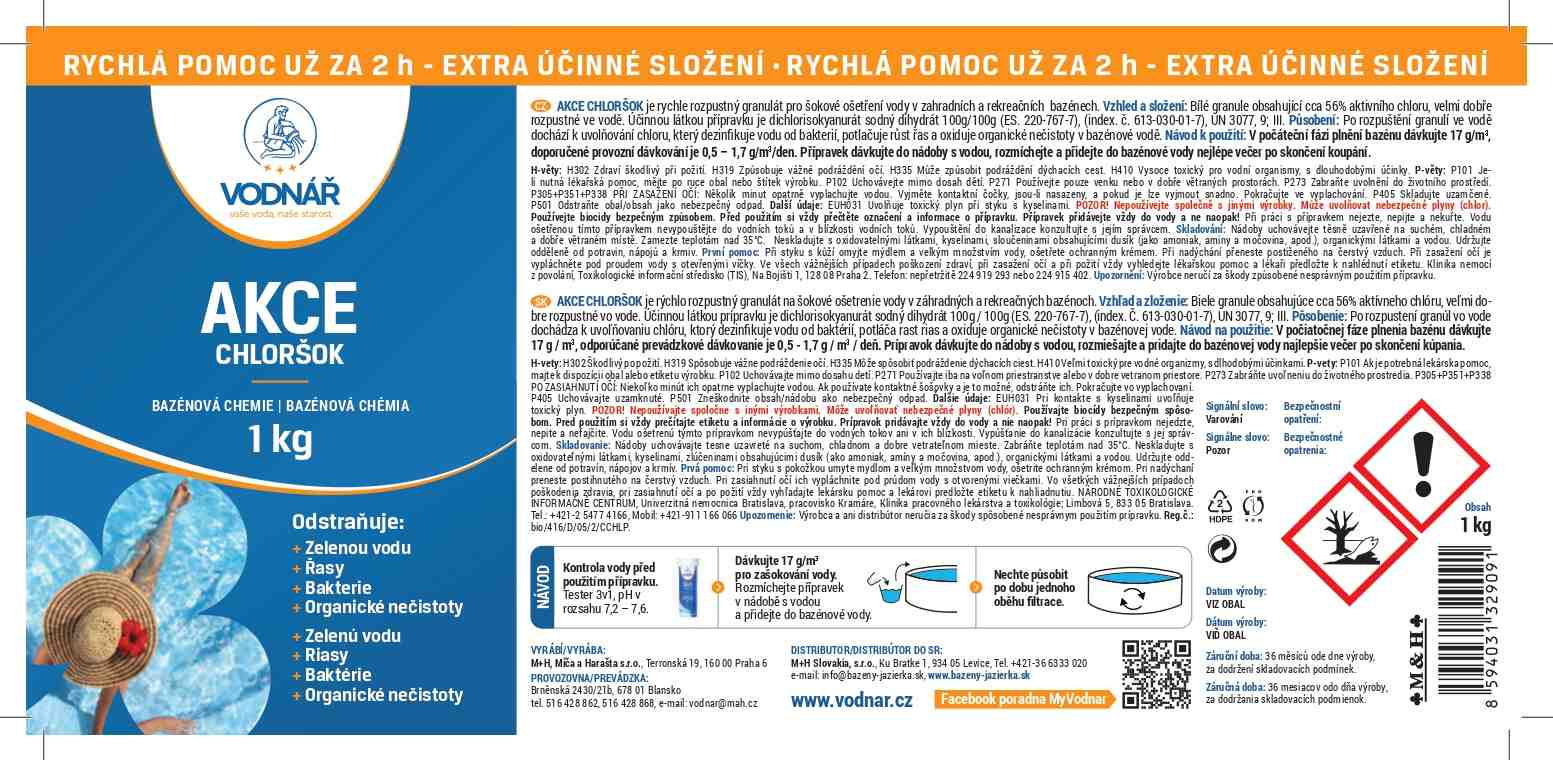 Vodnář Akce chloršok je rychle rozpustný granulát v sypké formě pro okamžité ošetření vody