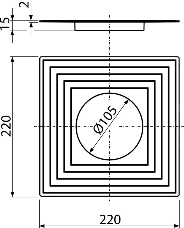 | APV1324 | Podlahová vpust 105×105/50 mm boční, mřížka nerez, nerezová příruba a límec 2. úrovně izolace, kombinovaná zápachová uzávěra SMART |