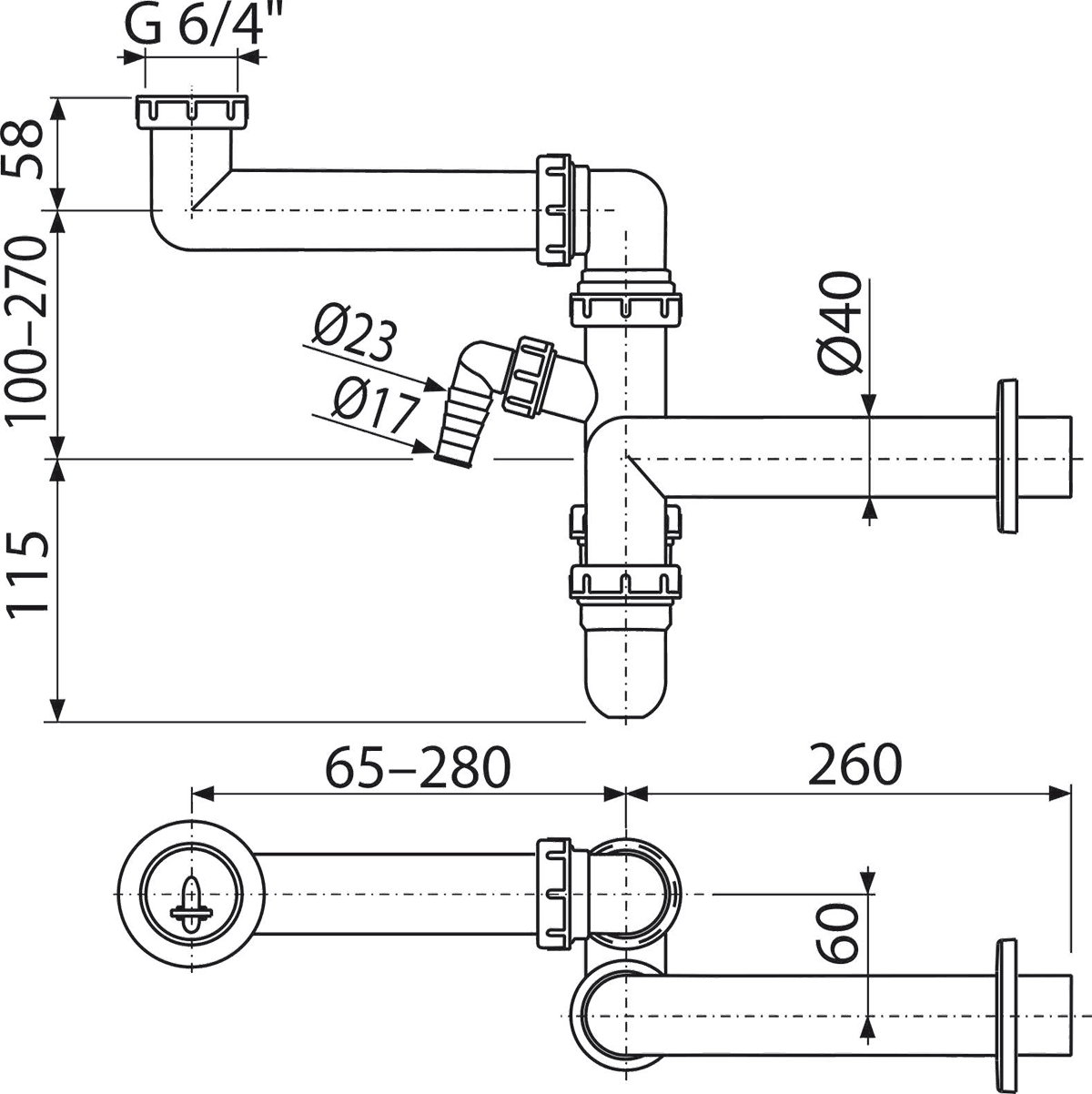 ALCADRAIN prostorově úsporný dřezový sifon s přípojkou a převlečnou maticí 6/4" A872P
