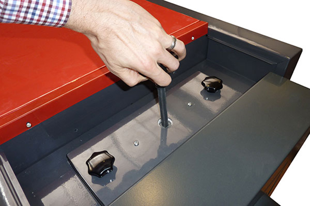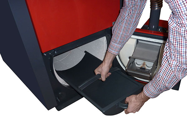 • Pohodlné vybírání popela – jednoduché čištění pouze zepředu. Popel vybereme z celé spalovací komory pomocí půlkulatého popelníku (příslušenství kotle). Popelník zasuneme do kotle na doraz, přiražením o zadní stěnu popel nahrneme do popelníku a vytáhneme. Popelník v kotli nikdy nenecháváme!