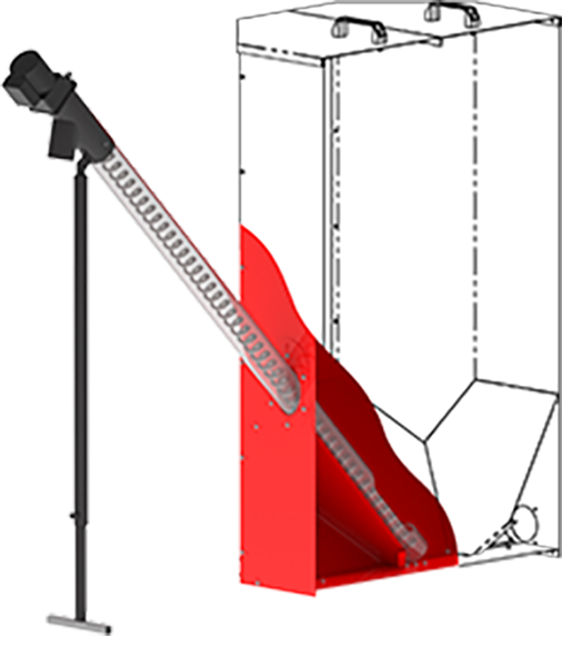 Jedná se o sadu nádrže na pelety o objemu 400l s dopravníkem DRA25 která je určena pro malé a stísněné kotelny. Umožňuje umístění nádrže v těsné blízkosti kotle, tak aby sestava zabírala málo místa.