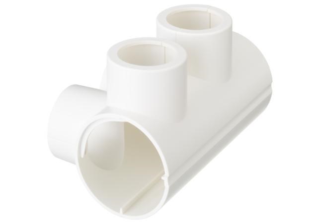 Ozdobný kryt z bílého plastu RAL 9010 pro armaturu VHS. Rohová verze válcového tvaru.