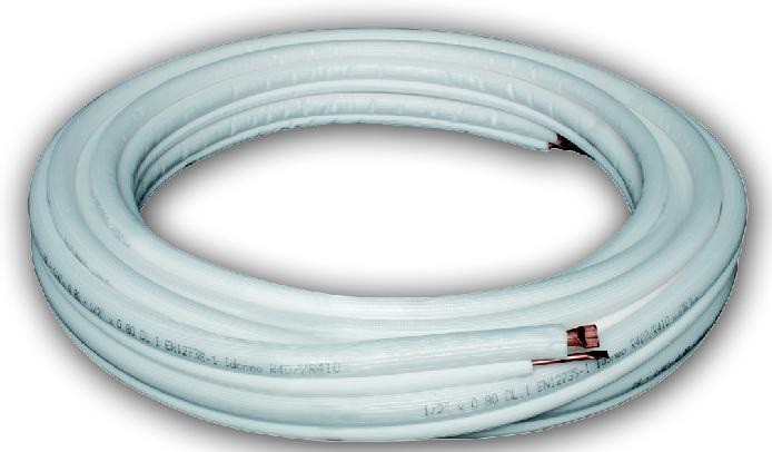 Bezešvé měděné trubky pro chladící a klimatizační zařízení s průmyslově vyráběnou tepelnou izolací z polyetylénové pěny a vnějším ochranným pláštěm z LDPE fólie odolné proti opotřebení a povětrnostním vlivům.