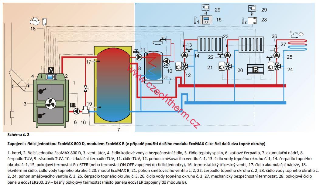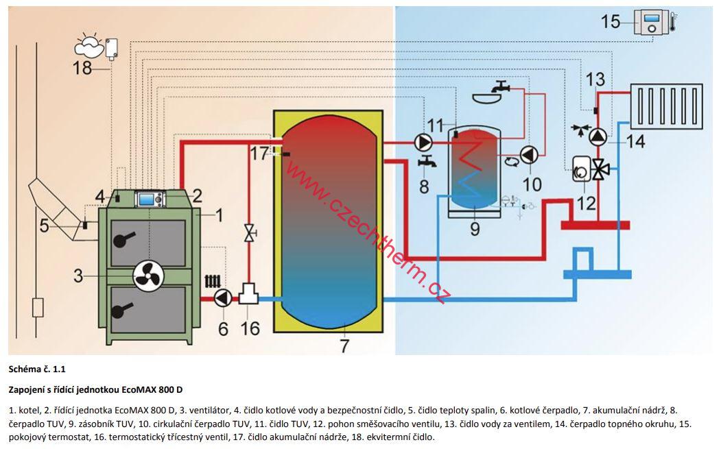 • Těleso kotle má tvar kvádru a je svařeno z kotlového plechu. V přední části jsou dvoje dvířka, horní slouží jako přikládací, spodní jako dvířka popelníková. V zadní části kotlového tělesa je trubkový výměník. Čistící otvor výměníku je umístěný na horní straně kotle spolu s otvorem pro výstupní vodu a řídící jednotkou. Na zadní straně kotle je otvor pro vstupní vodu, otvor pro napouštěcí ventil, dochlazovací zařízení a sopouch kotle. Na boku kotle je páka pro otvírání zatápěcí klapky. Tlačný ventilátor je umístěný pod krycím plechem mezi dvířky na přední straně kotle. Řídící jednotka kotle ovládá provoz a výkon ventilátoru v závislosti na teplotě kotle a teplotě spalin, ovládá čerpadlo UT a řídí ohřev akumulačního zásobníku. Řídící jednotka ecoMAX 800D ovládá i směšovací ventil topného systému a řídí ohřev TUV.