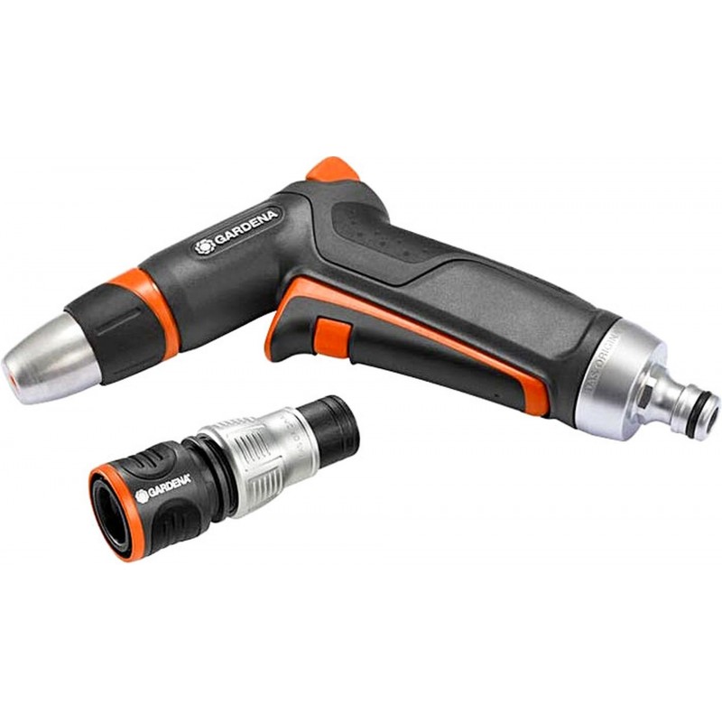Pevný GARDENA čisticí postřikovač Premium se hodí jak pro čištění, tak pro zavlažování. Pokud chcete průtok vody plynulý a trvalý, je možné uzamčít pulsní spoušť, díky čemu zabráníte únavě ruky. Dodáváno v sadě se stopspojkou Premium.