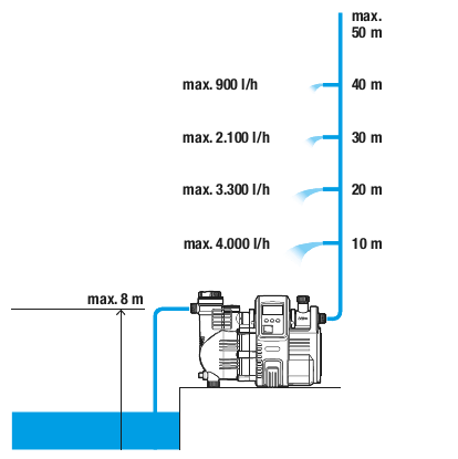 • Integrovaný zpětný ventil v čerpadle zaručuje snadnou manipulaci a rychlé uvedení do provozu. Optimalizovaný sací proces je zárukou toho, že vodu lze během několika sekund čerpat z hloubky až osmi metrů. Výkon je ideální pro středně velké až velké domy a zahrady.