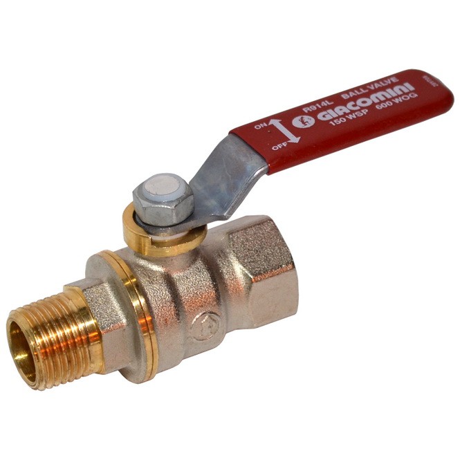 Kulový kohout s koulí DADO, s vnějším a vnitřním závitem, ovládání červenou páčkou. Niklovaný.