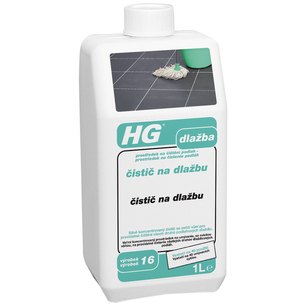 HG čistič na dlažbu (prostředek na čištění podlah) (HG výrobek 16) je silně koncentrovaný mopový čistič se svěží vůní, speciálně vyvinutý pro pravidelné čištění všech druhů dlažby a podlah z přírodních kamenů neobsahujících soli vápníku. Tento výrobek je rovněž vhodný na epoxidové podlahy.
