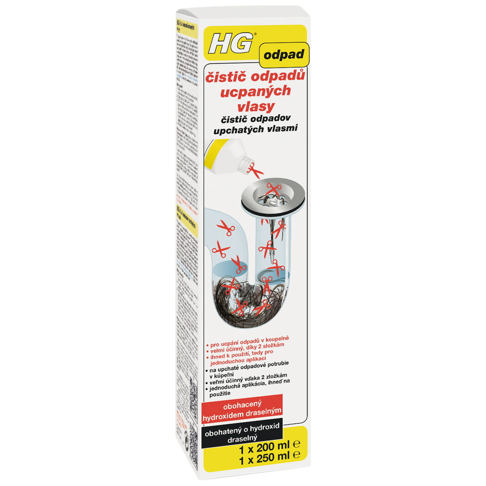 V koupelně jsou vlasy příčinou ucpání odtokových potrubí umyvadla, sprchy i vany. Toto ucpání se ještě zhoršuje díky zbytkům mýdla, kožního tuku a zubní pasty, které na vlasech ulpívají. HG "čistič odpadů ucpaných vlasy" je obohacen hydroxidem draselným a díky tomu si rychle a účinně poradí s těmito vlasy, které zcela rozpustí, stejně jako i s dalšími materiály, které na vlasech ulpívají.