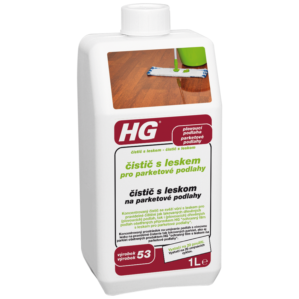 HG čistič s leskem pro parketové podlahy (čistič s leskem) (HG výrobek 53) je koncentrovaný mopový čistič s báječnou svěží vůní s leskem speciálně vyvinut pro pravidelné čištění jak lakovaných plovoucích podlah, tak i plovoucích podlah ošetřených přípravkem HG ochranné filmy pro parkety (HG výrobek 51/52).