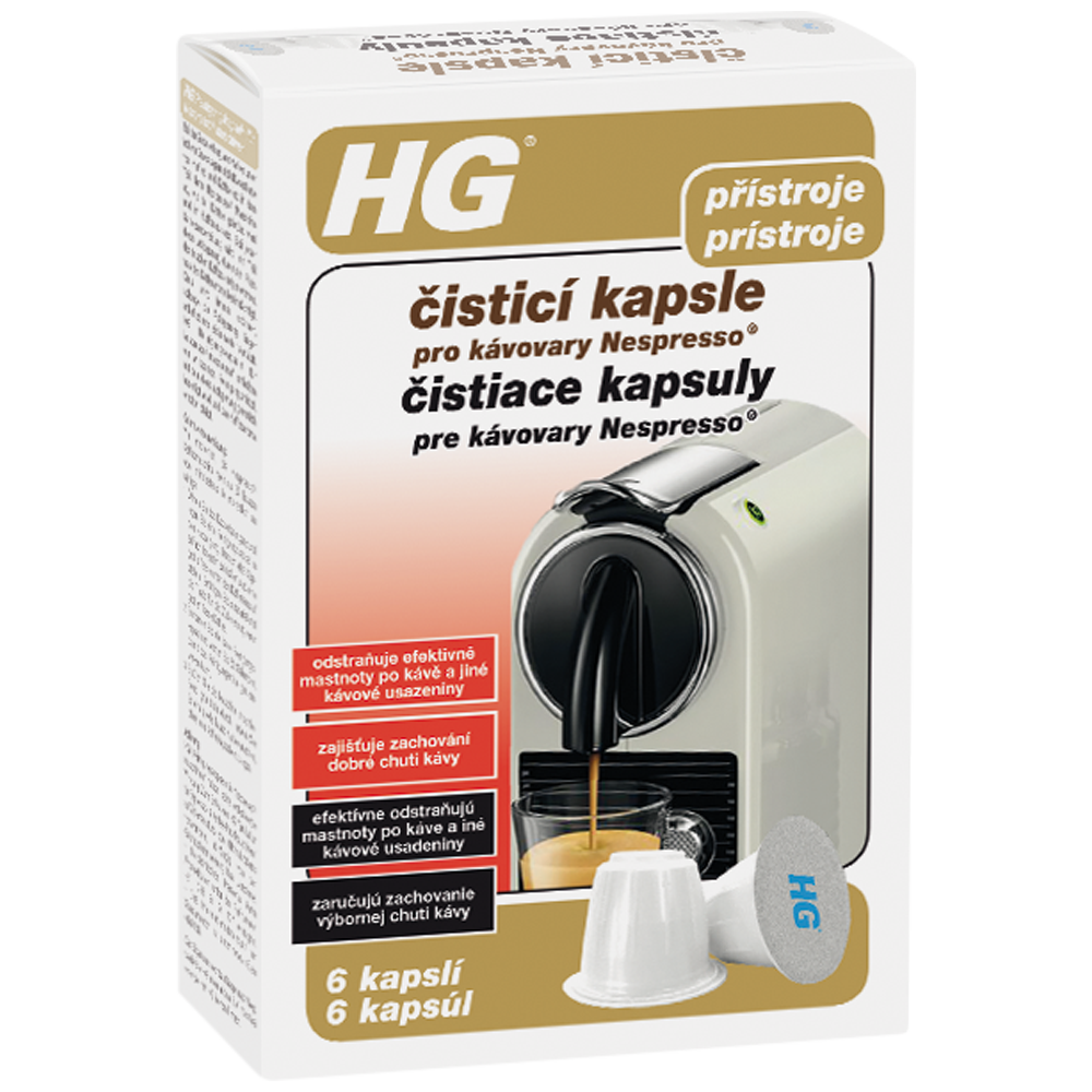 Příprava kávy pod tlakem vede k vytváření usazenin zbytků kávy a mastnot po kávě v části vašeho přístroje Nespresso®, kde je vytvářena káva, a v odtokové rource. Pokaždé, když se připravuje káva, přechází část těchto usazenin do čerstvé kávy, což má nepříznivý vliv na její chuť. To se zhoršuje v závislosti na tom, jak dlouho tyto usazeniny zůstávají v přístroji a hromadí se. HG "čisticí kapsle pro kávovary Nespresso®" obsahují velmi účinný čisticí prostředek, který důsledně odstraňuje usazeniny, přičemž není ovlivněna dobrá chuť kávy.