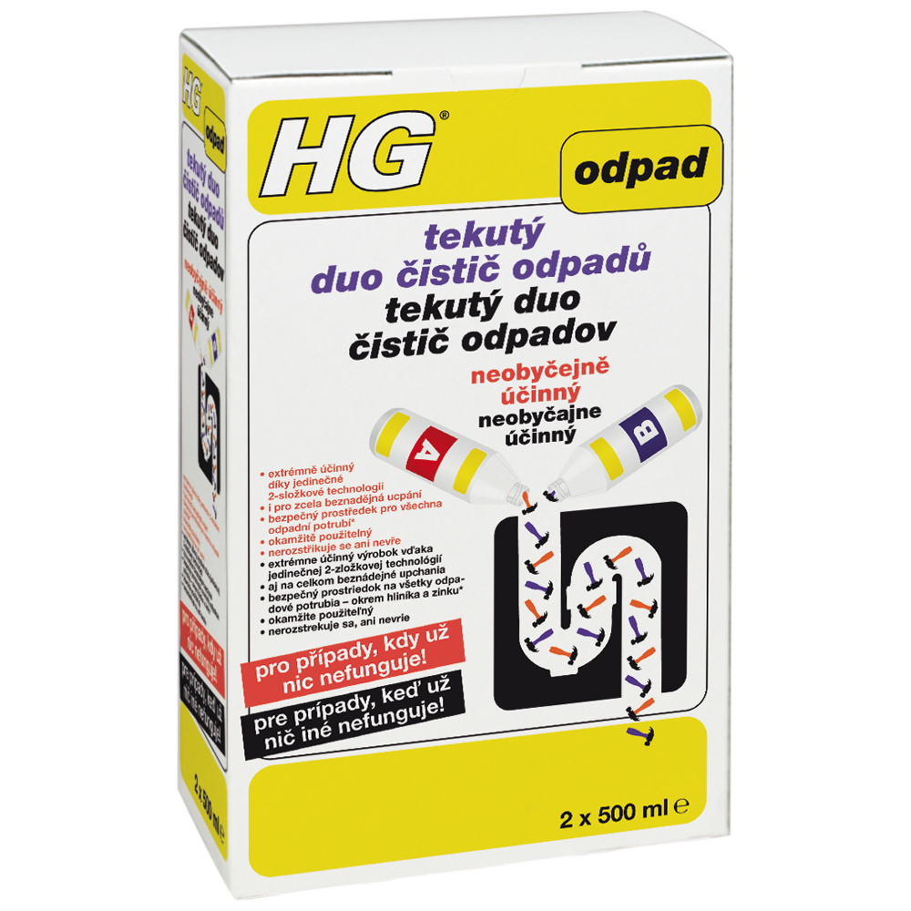 Specialisté ze společnosti HG speciálně vyvinuli HG tekutý duo čistič odpadů na nejúpornější ucpávání způsobené zbytky tuku a jídla (kuchyňský odpad) nebo vlasy, zubní pastou, zbytky mýdla nebo kožního tuku (sanitární odpad). Nepotřebujete již instalatéra! HG tekutý duo čistič odpadů vychází totiž z jedinečné dvousložkové technologie, díky které můžete sami jednoduše cíleně a efektivně odstraňovat různé druhy úporných ucpaných usazenin. Oba výrobky jsou připraveny k okamžitému použití a nemusí se ředit, čímž se ještě minimalizuje možnost vzniku skvrn.