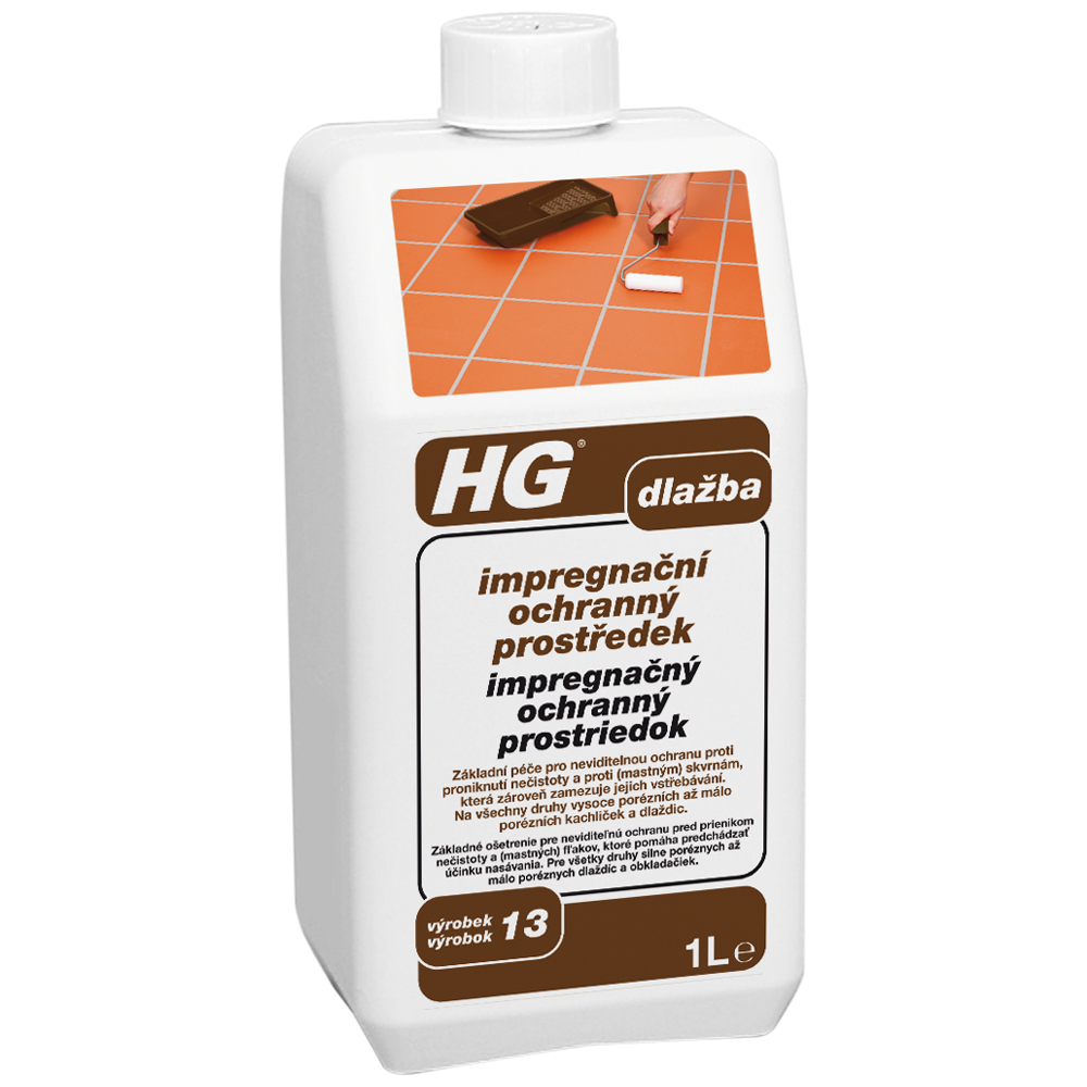 HG impregnační ochranný prostředek (HG výrobek 13) je speciální přípravný prostředek na (nové) neglazované kachličky a dlaždice. Tento jedinečný výrobek zamezuje nasávání a zabraňuje tak pronikání nečistoty a (mastných) skvrn, aniž by došlo k porušení původních vlastností kachličky, nebo uzavření podlahy. Tento výrobek je vhodný na všechny druhy porézních a málo porézních kachliček a dlaždic a lze ho použít jak v interiéru, tak i v exteriéru.
