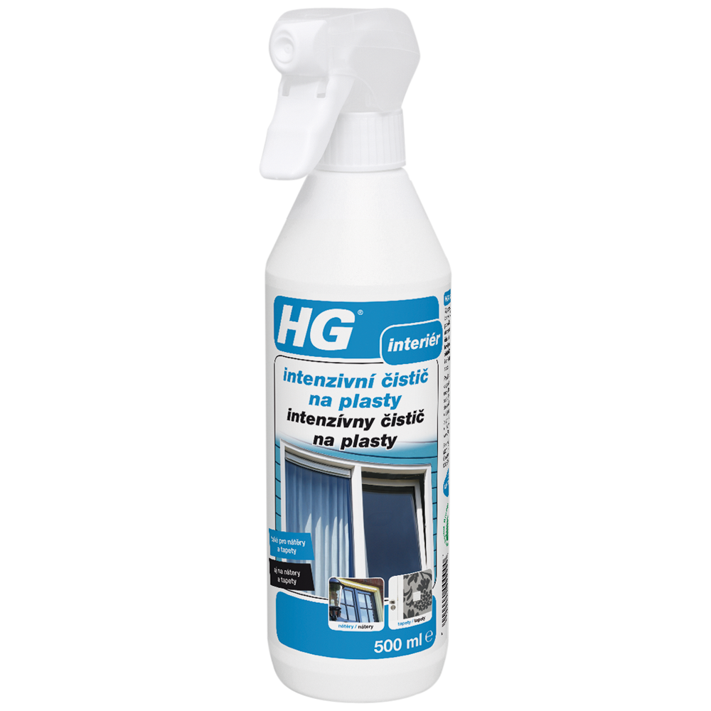 HG intenzivní čistič na plasty je vysoce účinný čistič pro všechny typy plastů, nátěrů a barev. Odstraňuje nánosy nikotinu, atmosférické nečistoty a spoustu jiných silných znečistění a to bez poškození povrchu. HG intenzivní čistič na plasty má mnoho oblastí použití – jako jsou plastová obložení, lamely, okenní rámy, obklady vnějších stěn, například panely Trespa ale také kuchyňské skříňky, omyvatelné tapety a pod.