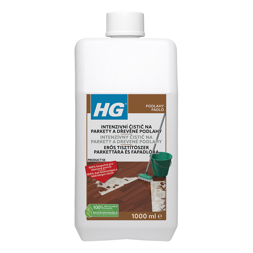 HG intenzivní čistič pro parketové podlahy (p.e. polish odstraňovač) (HG výrobek 55) je speciálně vyvinutý pro snadné, rychlé a bezpečné odstraňování silné nečistoty a mastnoty z lakovaných plovoucích podlah. Přípravek je zároveň vhodný pro odstraňování filmů leštidla a jiných filmů, jako HG ochranné filmy pro parkety (HG výrobek 51/52). Tento výrobek je naprosto bezpečný pro lakovanou vrstvu.