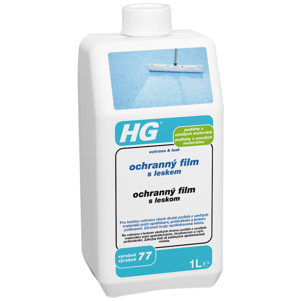 HG ochranný film s leskem (ochrana & lesk) (HG výrobek 77) je unikátní, tekutá polymerová emulze s velmi jednoduchým způsobem nanášení, která po vysušení vytvoří lesklý a tenoučký, ale mimořádně pevný ochranný film. Takto budou plastové podlahy, jako je vinyl, linoleum, marmoleum, PVC a nivelizační podlahy, chráněné proti opotřebení, škrábancům a jinému poškození. Tento ochranný film zakrývá i existující opotřebovaná místa a má protiskluzový efekt.