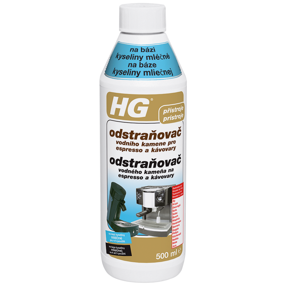 Přípravek HG "odstraňovač vodního kamene pro espresso a kávovary" na bázi kyseliny mléčné je speciálně vyvinut pro odstraňování vápenaté usazeniny z různých druhů kávovarů na espreso a kávovarů používajících kávové kapsle. HG "odstraňovač" na bázi kyseliny mléčné je jemnější než běžné odstraňovače vodního kamene na bázi kyseliny citronové, a je proto bezpečnější. I přes to má lepší účinek při odstraňování vodního kamene. Je bez zápachu a také zcela biologicky odbouratelný. Při pravidelném používání přípravku HG "odstraňovač vodního kamene pro espresso a kávovary" si káva udržuje svou výbornou chuť, přístroj si zachová svou rychlost, a kromě toho budete mít ze svého kávovaru na espreso nebo kávovaru používajícího kávové kapsle potěšení dlouhá léta!