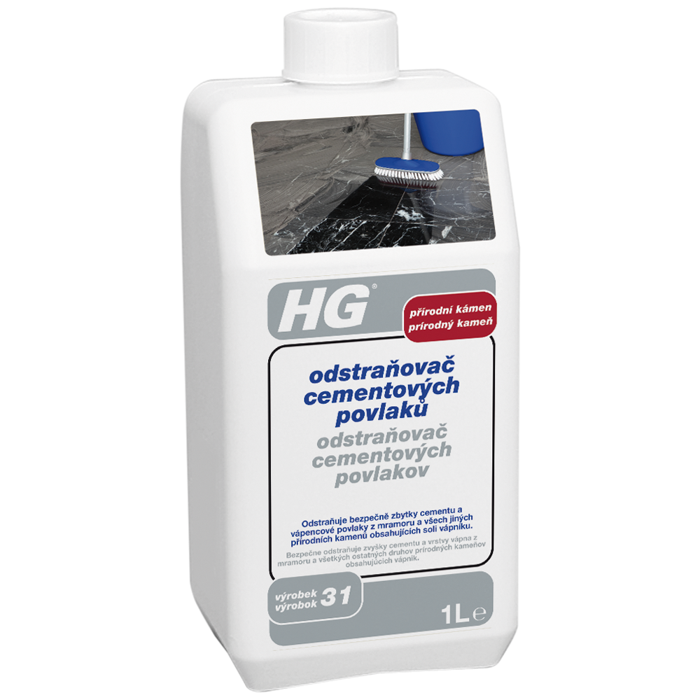 HG odstraňovač cementových povlaků (HG výrobek 31) je nekyselý a tudíž bezpečně odstraňuje zbytky cementu či vodního kamene z mramoru a dalších druhů přírodního kamene obsahujícího vápník, jako je např. travertin, modrý vápenec. ale je také vynikající na betonové či plastové dlaždice obohacené drtí přírodního kamene, jako např. žulový či mramorový kompozitní materiál.