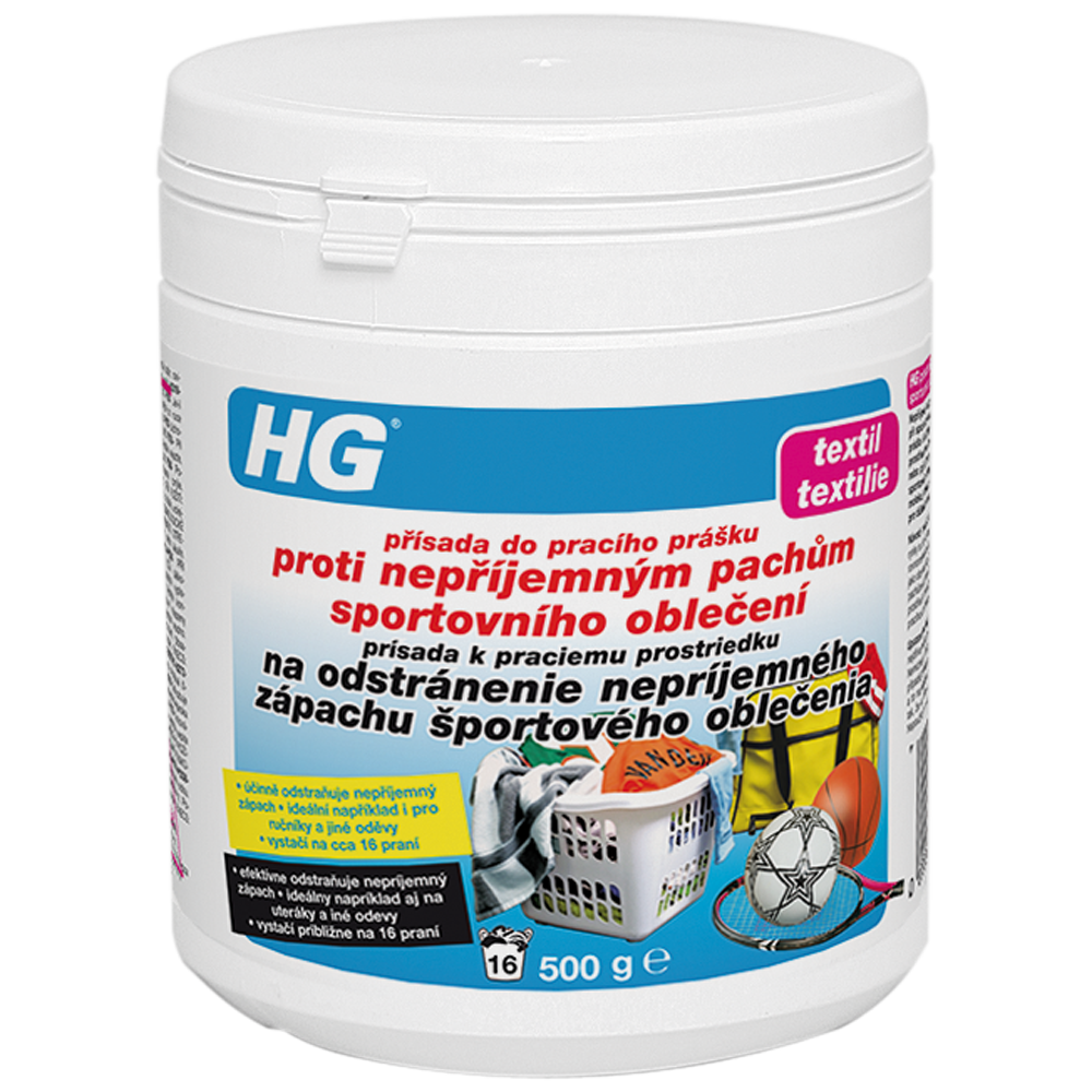Nepříjemný zápach sportovního oblečení, který vzniká v důsledku vyššího pocení při sportování nebo tím, že oděvy byly dlouho ponechány ve sportovní tašce, koši na prádlo či zůstaly příliš dlouho po vyprání v pračce, nelze dobře odstranit jen pracím prostředkem. Tento nepříjemný zápach se projeví zejména při žehlení těchto oděvů nebo při jejich nošení. HG přísada do pracího prášku proti nepříjemným pachům sportovního oblečení je mimořádně účinným přípravkem odstraňujícím spolehlivě molekuly zápachu, které pronikly hluboko do vláken. Tento produkt je proto ideální i pro důkladné odstranění zápachu například z ručníků, které po běžném vyprání nevoní svěže.