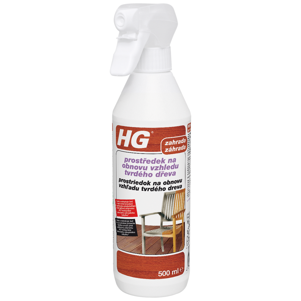Proto jsme vyvinuli pro vaše pohodlí HG prostředek na obnovu vzhledu tvrdého dřeva. Vrací šedému, zašlému dřevěnému zahradnímu nábytku i dalšímu venkovnímu dřevěnému zařízení svěží, čistý vzhled, a to pouze díky jednoduchému ošetření. Poté lze použít HG restaurátor tvrdého dřeva, který ochrání dřevo a vrátí mu jeho přirozený přitažlivý vzhled. HG prostředek na obnovu vzhledu tvrdého dřeva lze také použít na jiná dřevěná zařízení, například na meranti, mahagon a borovicové dřevo ale rovněž pro proutěný a/nebo ratanový či bambusový nábytek."