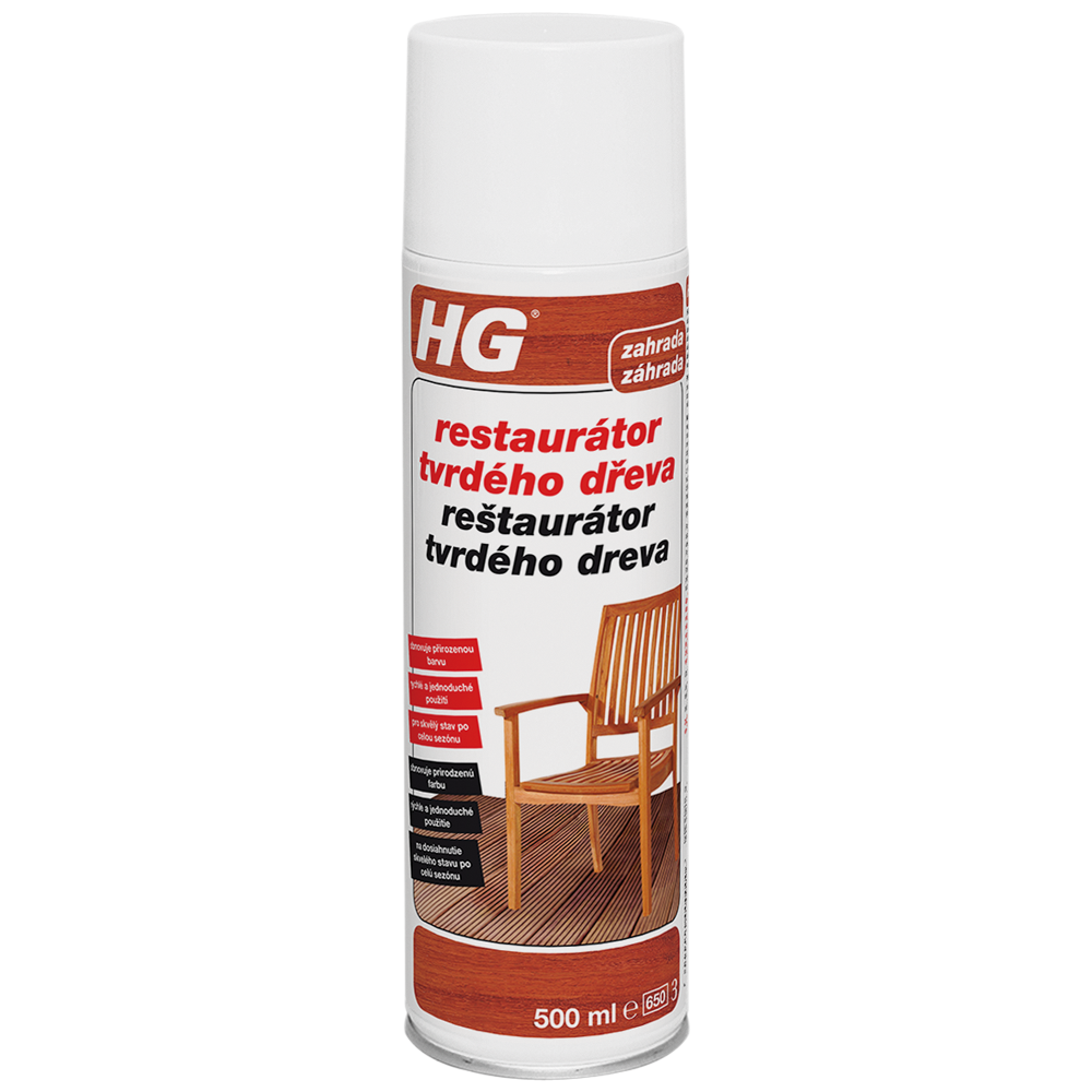 HG restaurátor tvrdého dřeva byl vyvinut speciálně k ošetření a na ochranu zahradního nábytku z tvrdého dřeva. Zesilňuje barevný tón a propůjčuje vašemu zahradnímu nábytku pěkný, přirozený lesk. Tvrdé dřevo obsahuje minerální složky, které vlivem počasí mění barvu. Proto tvrdé dřevo časem zšedne. HG restaurátor tvrdého dřeva zabraňuje tomuto zšednutí a eliminuje ho, váš zahradní nábytek dá rychle, jednoduše a na mnoho měsíců do perfektního stavu a zároveň ho činí odolným proti vodě.