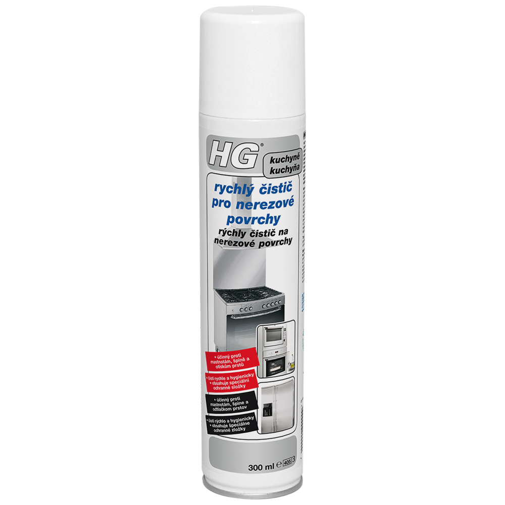 HG rychlý čistič na nerezové povrchy je účinný, profesionální čistící přípravek na rychlé a snadné odstraňování mastnoty, špíny a otisků prstů z nerezové oceli, chromu a hliníku, který nenechává naprosto žádné šmouhy. Proto je tento výrobek ideální na čištění vařičů, omyvatelných stěn za sporákem, digestoří, ledniček, mikrovlnek atd. HG rychlý čistič na nerezové povrchy navíc vytváří neviditelnou ochrannou vrstvu, díky níž lze špínu příště odstranit ještě snadněji.