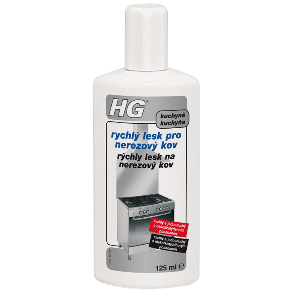 "Přípravek HG rychlý lesk pro nerezový kov dodá nerezovému kovu takový lesk jako nikdy předtím a stane se také nepostradatelným pomocníkem v kuchyni. HG rychlý lesk pro nerezový kov je ošetřující a ochraňující prostředek připraven k přímému použití. Matným místům dodá opět lesk a