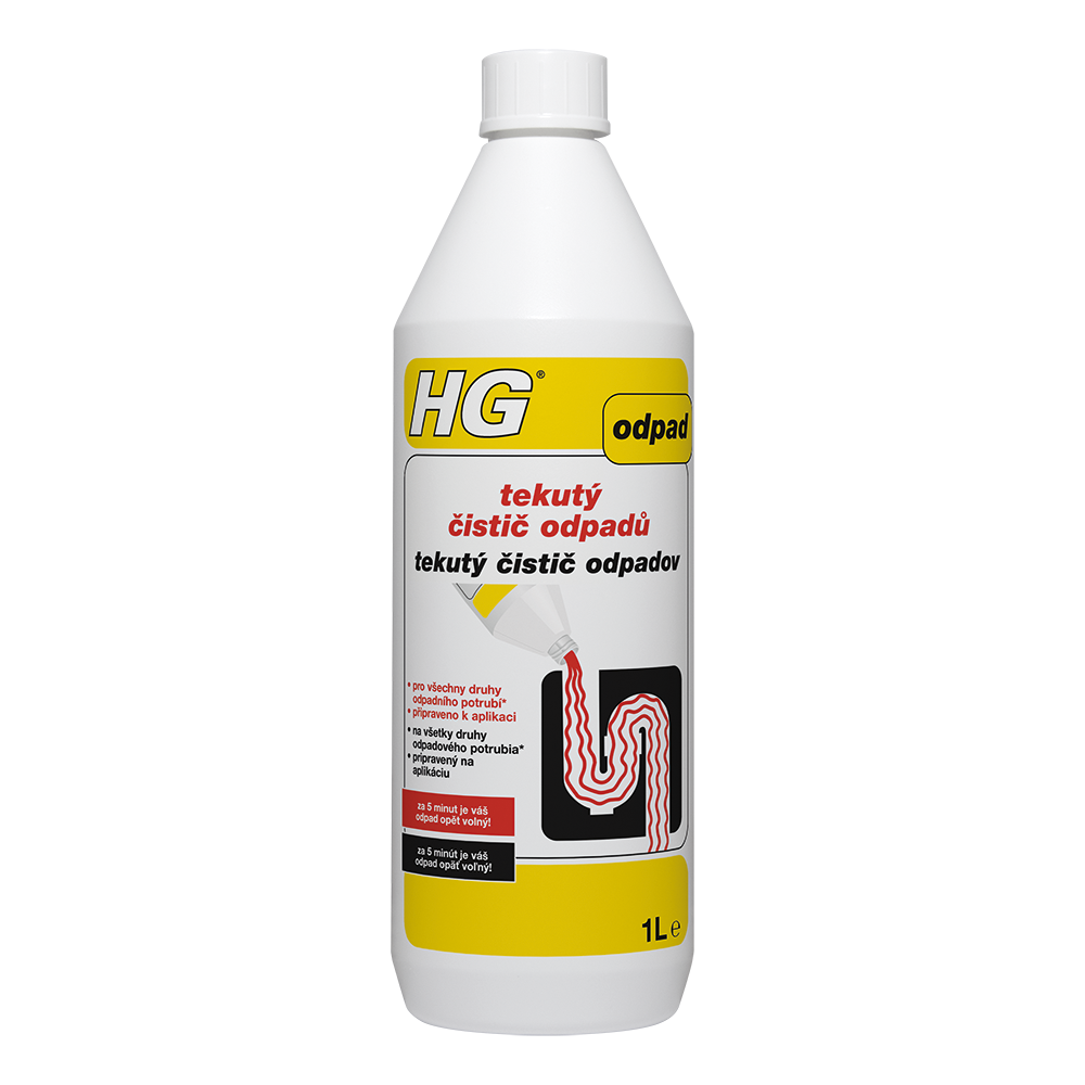 HG "tekutý čistič odpadů" je jedinečný, bezpečný, avšak velice silný čistič odpadů, který nabízí mnoho výhod. Tím, že je výrobek připraven přímo k použití, nemusíte ho ředit, takže riziko rozstříkání je menší. Výrobek nešumí ani nestříká, když ho lijete do odpadu. Mimoto, tento výrobek nemůže na rozdíl od zrnitých čističů odpadů, ucpání (zanesení) zhoršovat a nepoškozuje plastové odpadní trubky.