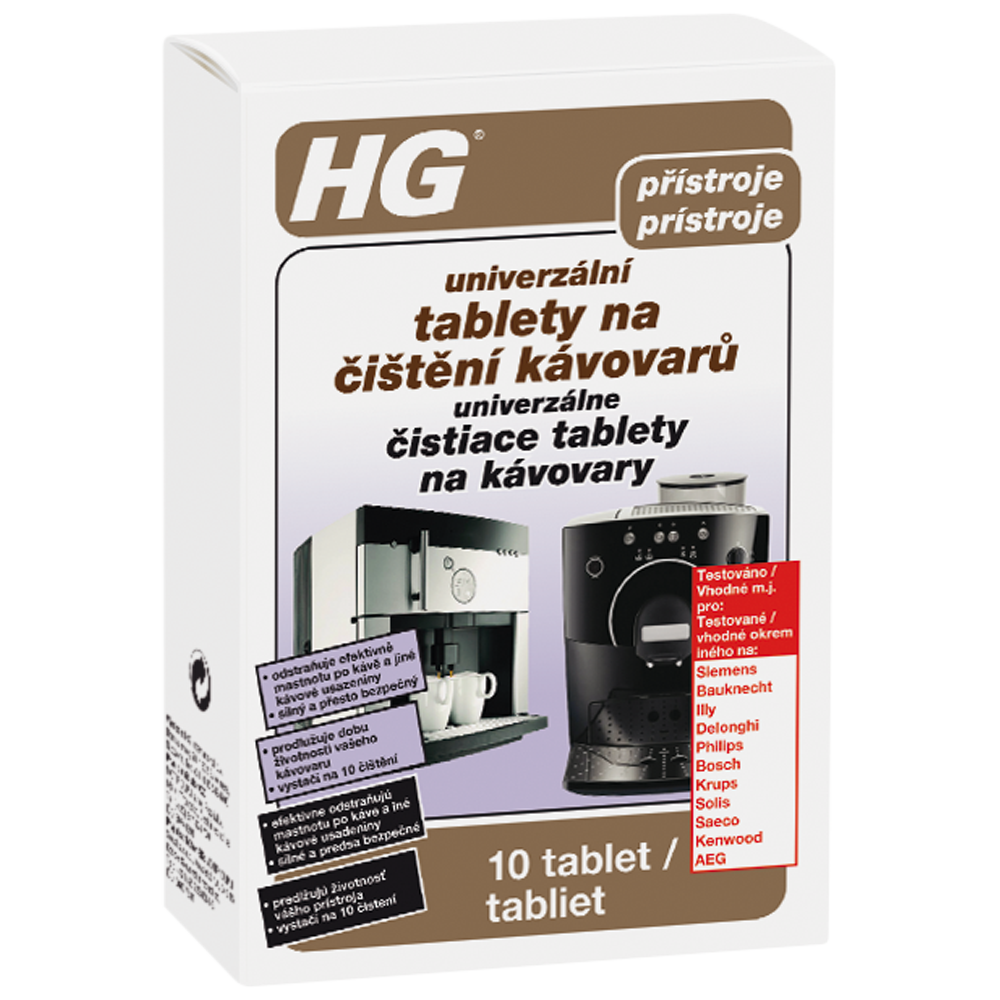 Mletí kávových zrn a příprava kávy tlakem způsobuje, že se ve vnitřním systému a potrubí (plně) automatických kávovarů vytváří usazeniny mastnoty z kávy a olejů. HG "univerzální tablety na čištění kávovarů" nejen zajistí, že vaše káva bude mít stále optimální chuť, ale jsou také zásadně důležité pro dlouhou životnost vašeho přístroje a zabránění poruchám. HG "univerzální tablety na čištění kávovarů" byly testovány a jsou vhodné mimo jiné pro (plně) automatické kávovary značek Siemens, Bauknecht, Illy, Delonghi, Philips, Bosch, Krups, Solls, Saeco, Kenwood a AEG.