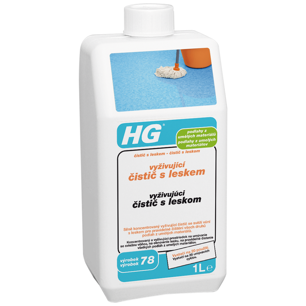 HG vyživující čistič s leskem (čistič s leskem) (HG výrobek 78) je koncentrovaný a vyživující mopový čistič se svěží vůní s leskem, speciálně vyvinutý pro pravidelné čištění všech druhů podlah z umělých materiálů, jako vinyl, linoleum, marmoleum, PVC a lité podlahy.