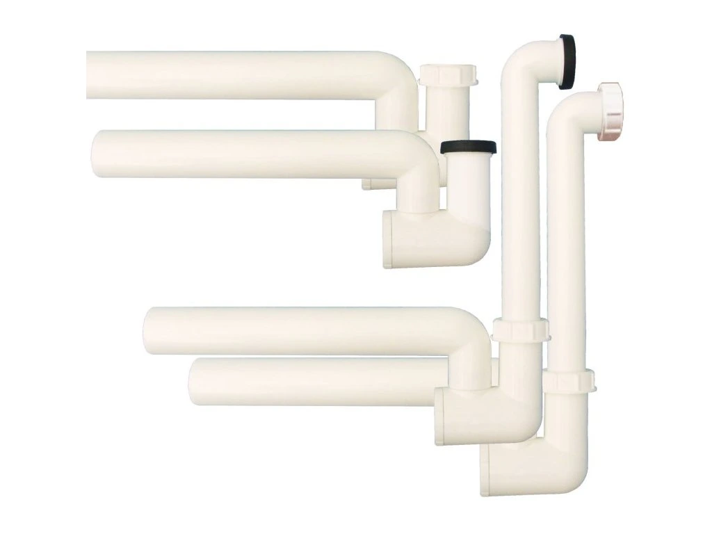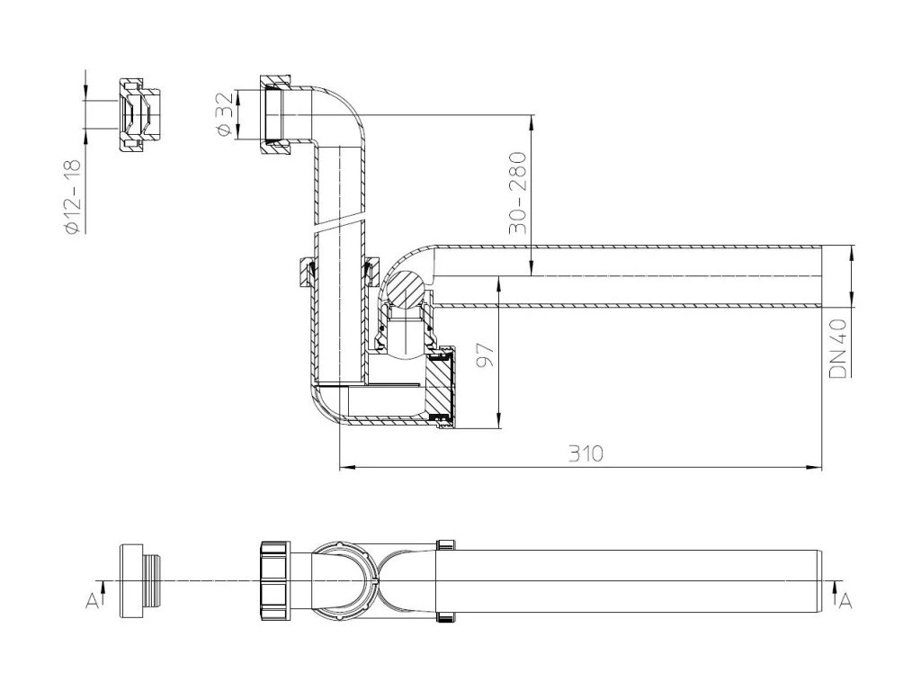 Kondenzační sifon DN40 s vodorovným odtokem a svislým nebo vodorovným připojením 5/4" (svěrné připojení) popř. d 12-18 mm (pro hladké trubičky s břitovým těsněním) s vodní zápachou uzávěrkou (60 mm) a mechanickým zápachovým uzávěrem(kulička) a čistící vložkou. Je určena pro klimatizační vzduchotechnické jednotky, odvody kondenzátu z komínů a pod.