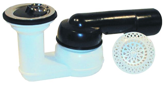 Zápachová uzávěrka DN40/5O s vodorovným odtokem, pro vany sprchových koutů s odpadním ventilem 6/4” a zátkou, s kulovým kloubem na odtoku (otáčivý 280°, 10° sklopný), sítko na nečistoty v balení