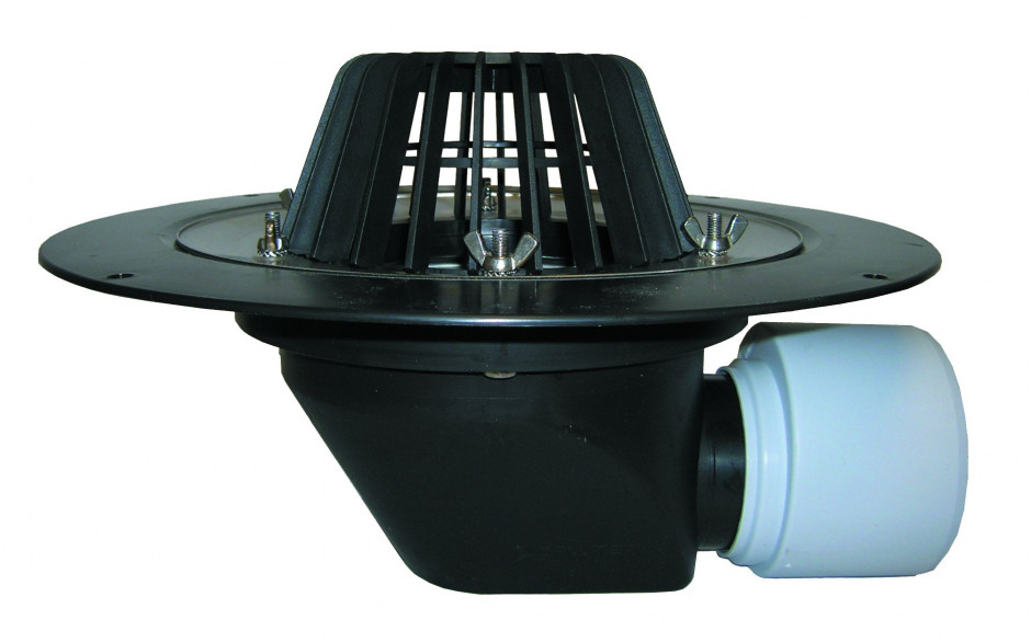 Strešní vpusť DN75/110 s vodorovným výtokem, s izolační svorkou a maticemi z nerezové ocele, tepelně izolovaná se záchytným košom.