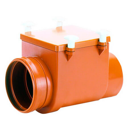 Automatická zpětná armatura proti vzduté vodě DN160 s vyjímatelnou klapkou z nerezové oceli a revizním krytem k čištění.