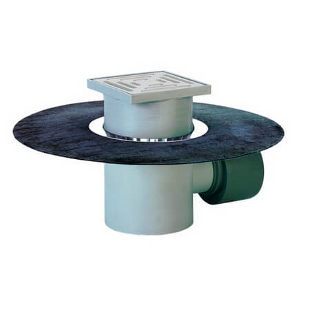Podlahová vpust DN75/110 s vodorovným odtokem, s továrně připojeným živičným izolačním pásem, se sifonovou vložkou, s plastovým nástavcem 20 - 70mm, s plastovým rámem 147x147mm a plastovou vtokovou mřížkou 138x138mm, revizním čistícím otvorem a sítkem na nečistoty. Sifonová vložka -výška vodního uzávěru 60mm.