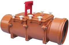 Automatická zpětná armatura proti vzduté vodě DN200 se dvěma klapkami z nerezové oceli a ručním zajištěním jedné klapky a revizními kryty k čištění.