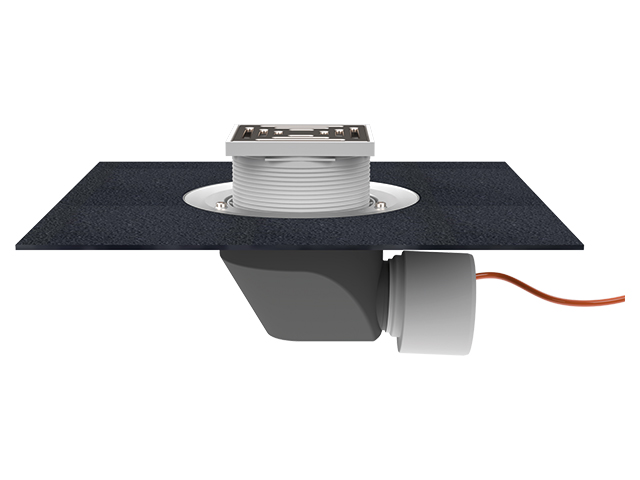 Střešní vtok DN75/110 s vodorovným odtokem v provedení pro pochůzné střechy, s továrně připojeným živičným izolačním pásem pro ideální napojení na tomu odpovídající hydroizolace, s elektrickým ohřevem se samoregulací (10-30W, 230V), s plastovým nástavcem 12 - 65mm a rámečkem 148x148mm s mřížkou z nerezové oceli 137x137mm