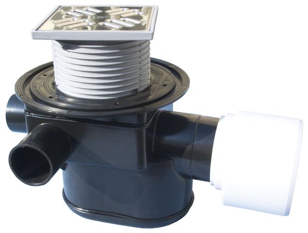 Podlahová vpust DN75/110 s vodorovným odtokem, s izolačním límcem, s automatickým a nouzovým uzávěrem proti vzduté vodě (Typ 4 dle ČSN13564), se zápachovým uzávěrem, revizním čistícím otvorem, 3 boční přítokové trubky DN40/50, s plastovým výškově stavitelným nástavcem 12 - 70mm a rámečkem 123x123mm, mřížkou z nerezové oceli 115x115mm. Stavební kryt v balení.
