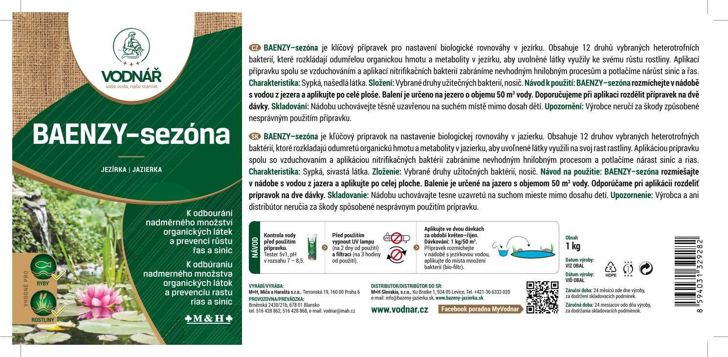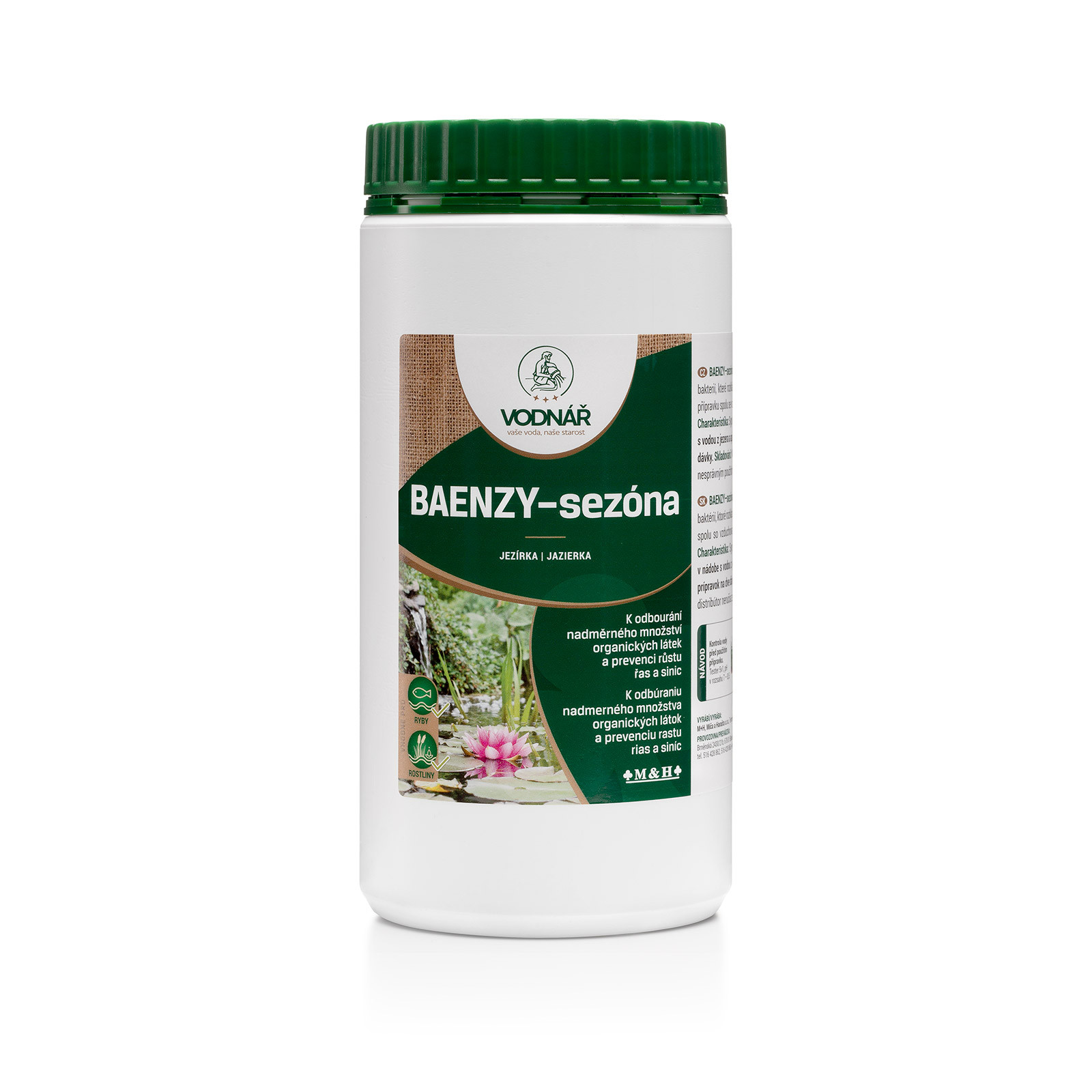 Vodnář BAENZY-sezóna je plně přírodní a velmi šetrný bakteriální přípravek, určený k pravidelné péči o přírodní jezírka. Obsahuje vyváženou kombinaci žádoucích heterotrofních bakterií a enzymů, které v jezírku přirozenou cestou zajišťují rozklad odumřelé organické hmoty nahromaděné na dně i ve vodním sloupci.