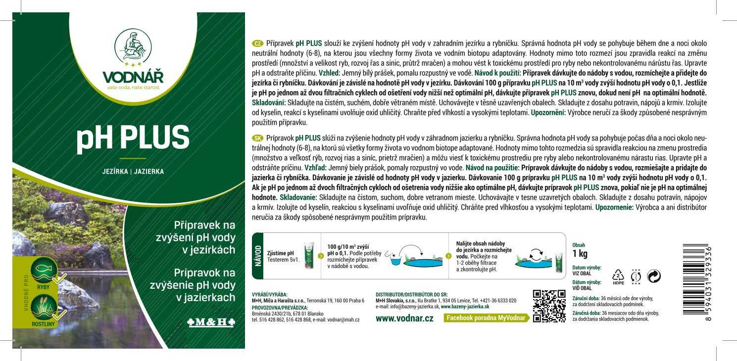 Přípravek Vodnář pH plus – jezírka slouží k šetrnému zvýšení pH vody v koupacích a přírodních jezírkách v situacích, kdy je voda příliš kyselá a nachází se pod doporučeným rozmezím pH. Jedná se o sypký přípravek, ze kterého se připraví vodný roztok a ten se následně aplikuje přímo do jezírka. Takto lze pH vody upravovat postupně, přesně a bezpečně podle aktuálních potřeb jezírka.