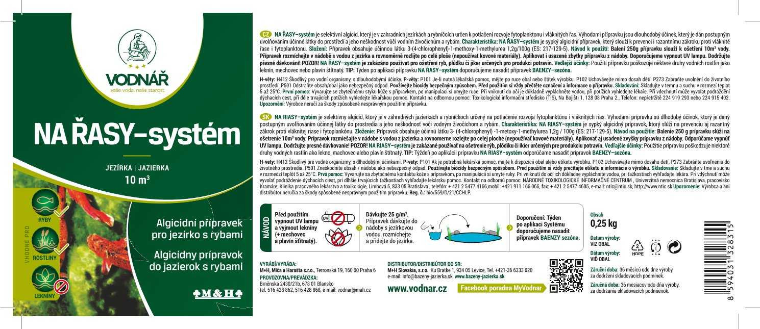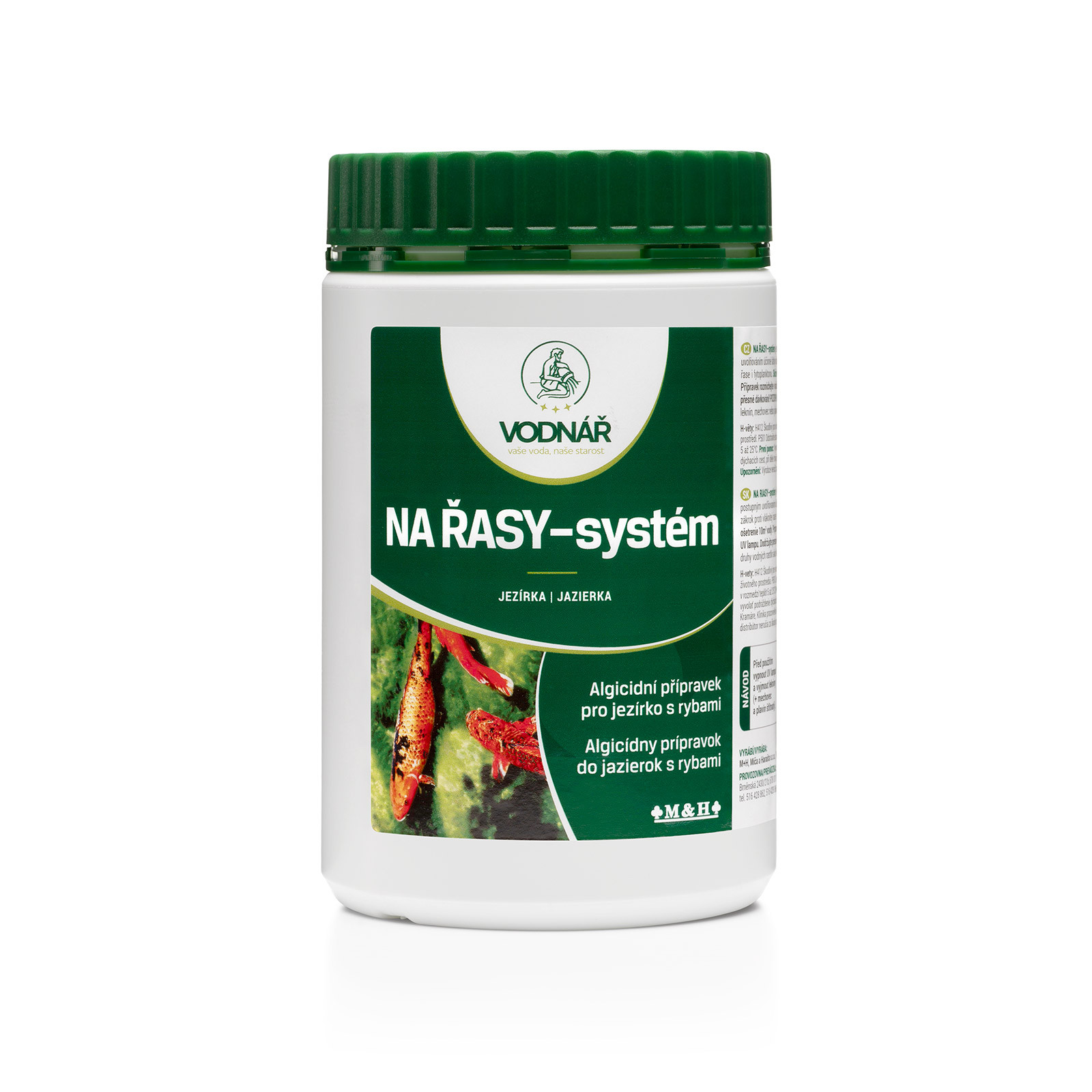 Jedná se o selektivní algicidní látku určenou do přírodních jezírek s rybami, která cíleně čistí a potlačuje opětovný růst zelené vody a sinic. Přípravek NA ŘASY - systém zároveň působí na vodní ekosystém zahradních jezírek a rybníčků, čímž pozitivně ovlivňuje welfare chovaných ryb, tedy zlepšuje jejich životní podmínky v prostředí.