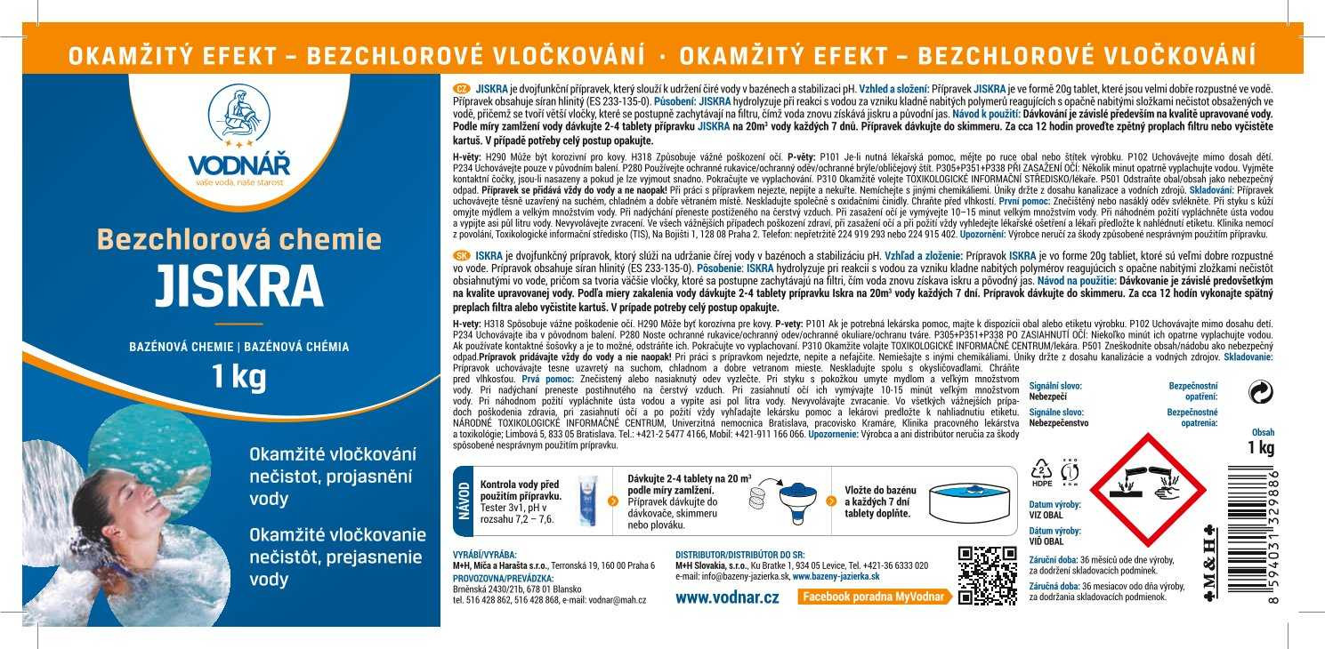 Přípravek Vodnář Jiskra hydrolyzuje při reakci s vodou za vzniku kladně nabitých polymerů. Tyto polymery reagují s opačně nabitými složkami nečistot obsaženými ve vodě.