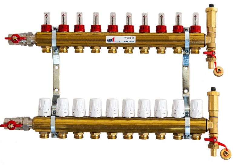 PROFI 4 je mosazný rozdělovač české výroby určený jak pro podlahové vytápění tak pro připojení otopných těles (radiátorů). Velkou výhodou PROFI rozdělovačů, je jednoduchá montáž a velmi jednoduché vyregulování jednotlivých otopných okruhů topného systému díky průtokoměrům. Rozdělovače jsou osazeny 1" kulovými kohouty se šroubením a vnitřním závitem pro připojení. Ruční hlavice lze nahradit termoelektrickými pohony KiipTherm. Pro ovládání elektrických pohonů doporučujeme prostorový termostat Elektrobock PT713-EI osazený kapilárou do podlahy pro hlídaní teploty podlahy. Jinak lze použít jakýkoliv spínací termostat na 230V nebo 24V dle použitého elektropohonu Honeywell Smart-T.