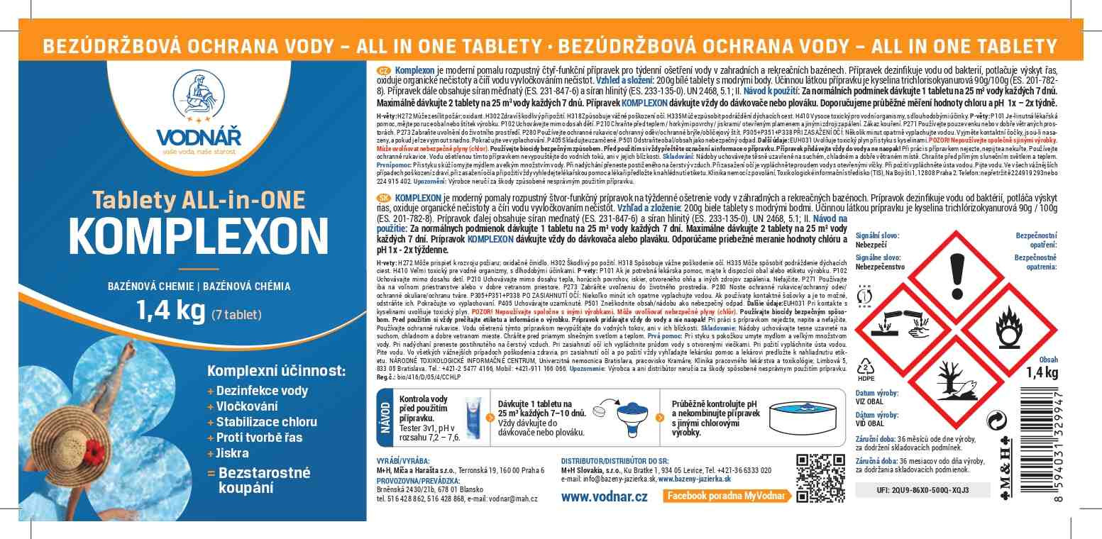 KOMPLEXON je vysoce účinný multifunkční chlorový přípravek, který zajišťuje kompletní péči o bazénovou vodu v jediné VŠE-v-1 tabletě. Spolehlivě dezinfikuje vodu od bakterií a mikroorganismů, omezuje růst řas, rozkládá organické nečistoty a zároveň stabilizuje aktivní chlor i pH vody. Díky vločkovacím složkám váže jemné nečistoty, které se snadno zachytí ve filtraci, což vede k jasnější a průzračnější vodě. Tablety KOMPLEXON o velikosti 200 g jsou určené pro větší zahradní bazény nad 20 m3. Pravidelným používáním udržují bazén čistý, hygienicky bezpečný a bez zákalu bez nutnosti složité údržby.