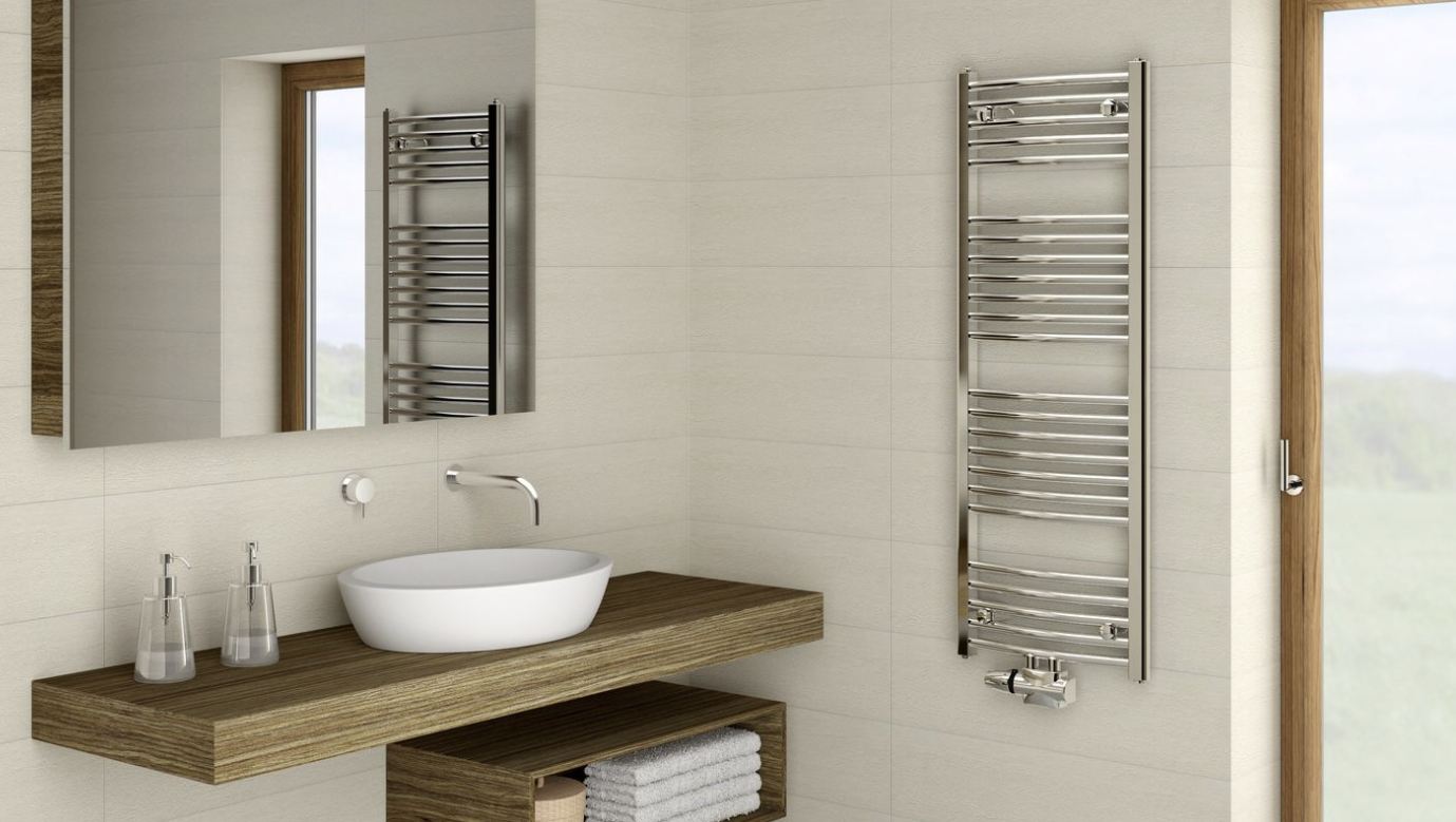 Elegantní chromovaná tělesa s prohnutými profily a moderním středovým připojením
