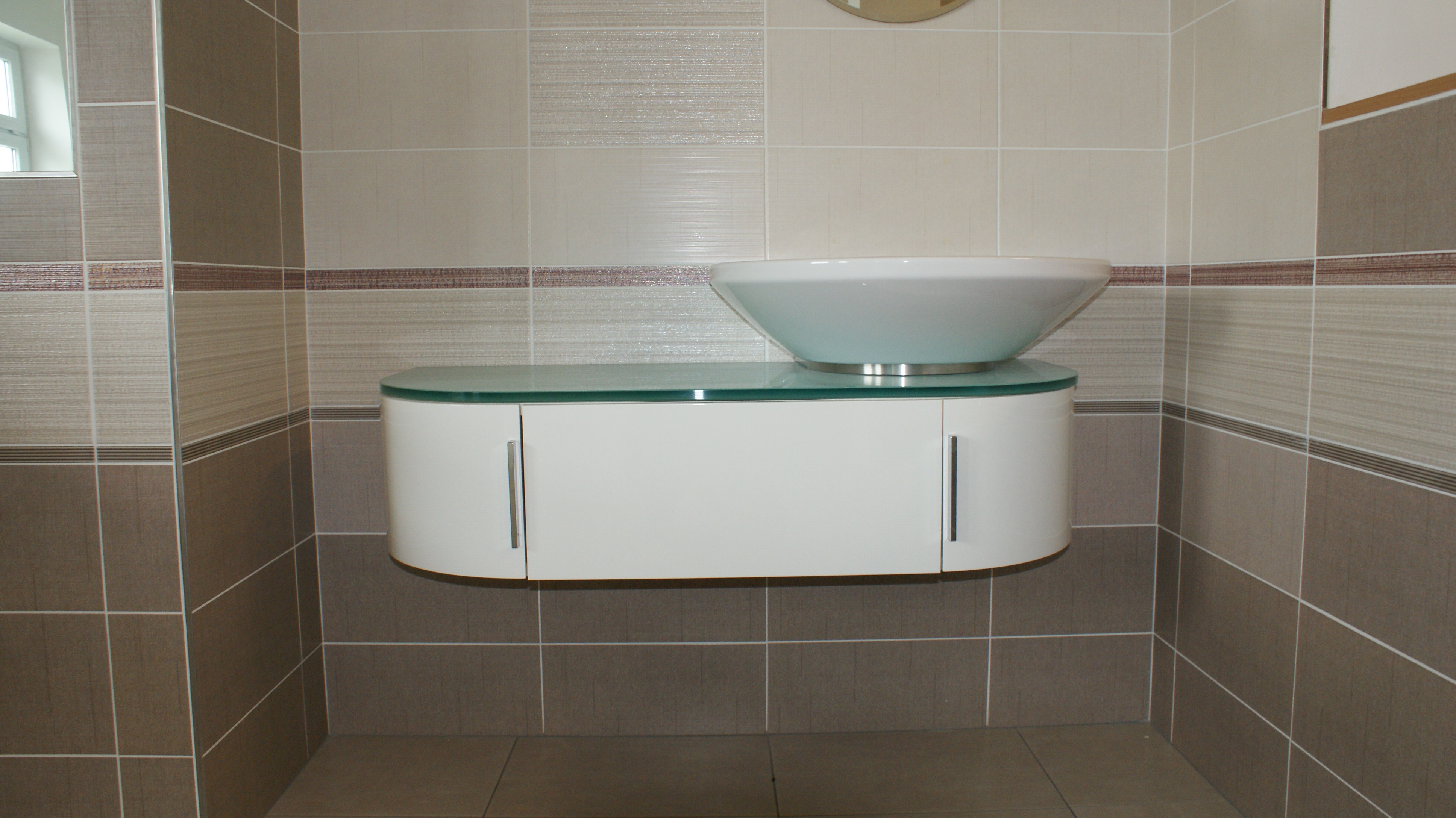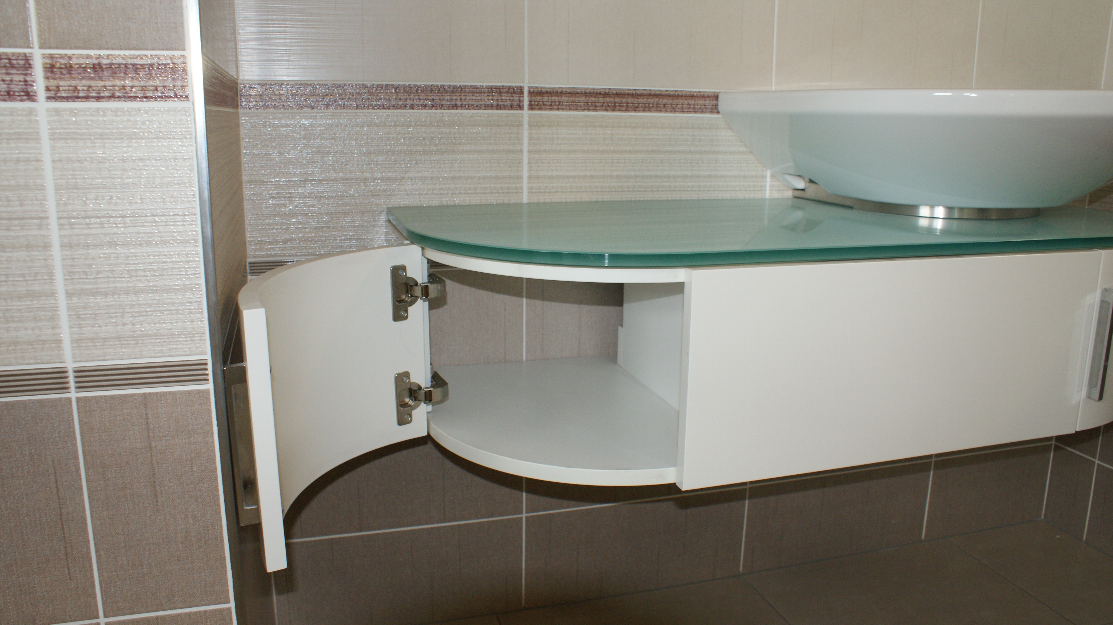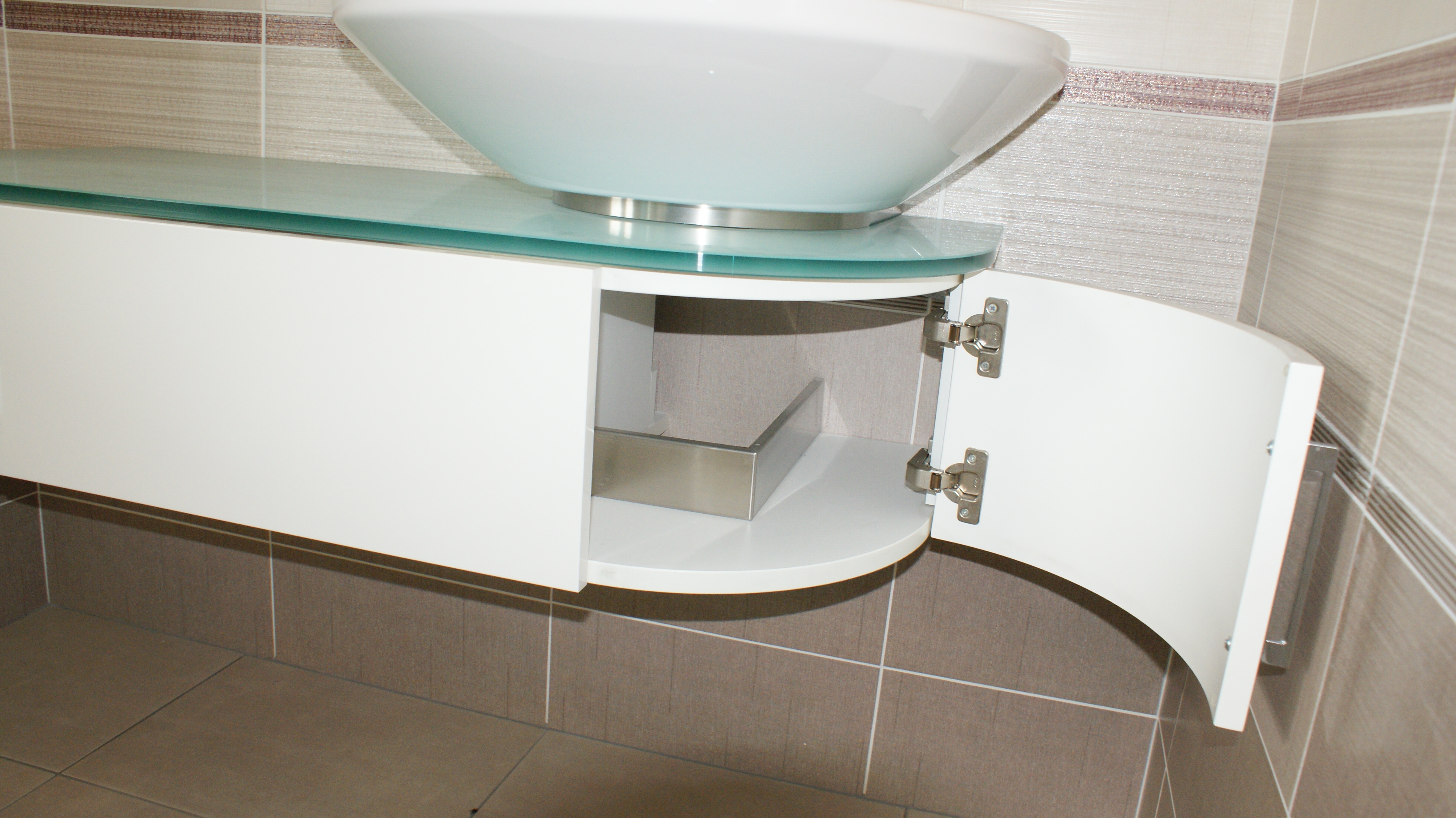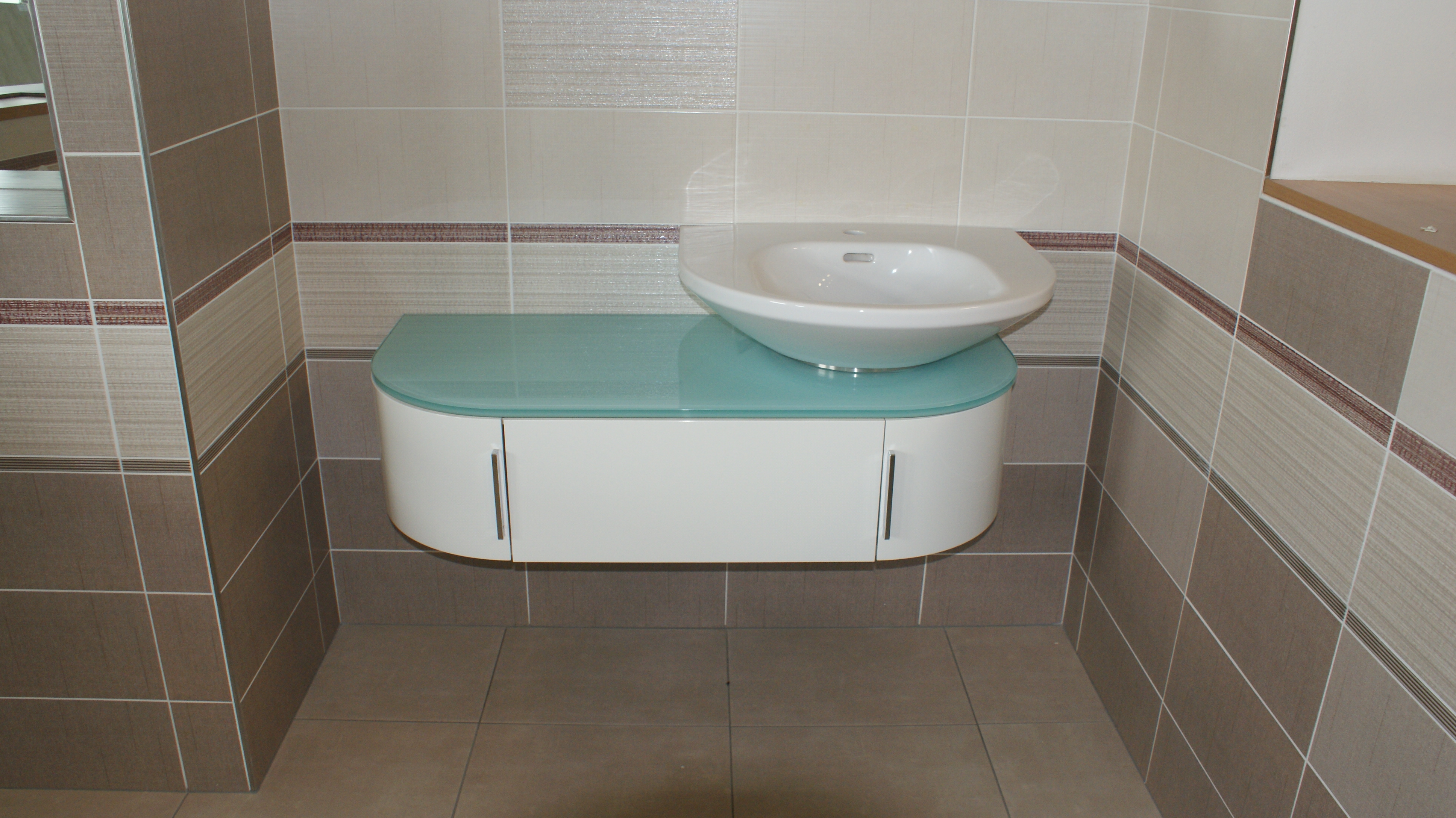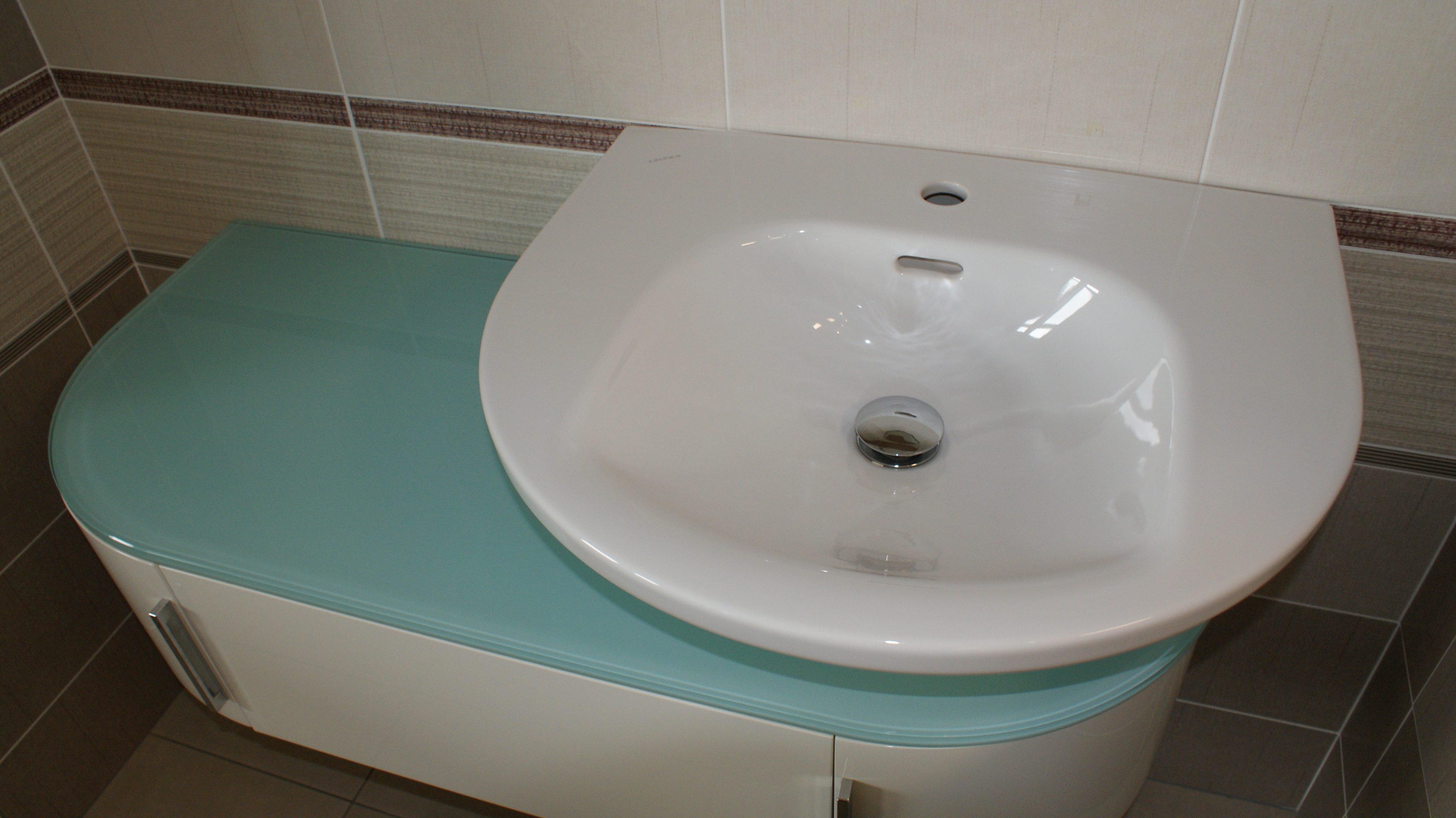 - Skříňku pod umyvadlo LAUFEN, asymetrická bíla 106x45cm, deska - sklo