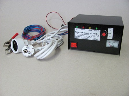 Přístroj zálohuje síťové napětí 230V, 50 Hz. Je-li přítomno síťové napětí, přístroj dobíjí připojený olověný akumulátor a udržuje ho v nabitém stavu. Dojde-li k výpadku sítě, náhradní zdroj NZ UNI se automaticky přepne na měnič 12V/230V/50Hz, který z připojeného akumulátoru 12V vyrábí chybějící síťové napětí 230V/50Hz. Součástí přístroje je i termostat, jehož čidlo snímá z horkého vývodu vody z kotle nebo krbové vložky teplotu vody a sepne čerpadlo při teplotě, kterou si nastavíte knoflíkem na čelním panelu náhradního zdroje NZ UNI. Je-li knoflík na levém dorazu, čerpadlo se točí stále, nezávisle na teplotě čidla.