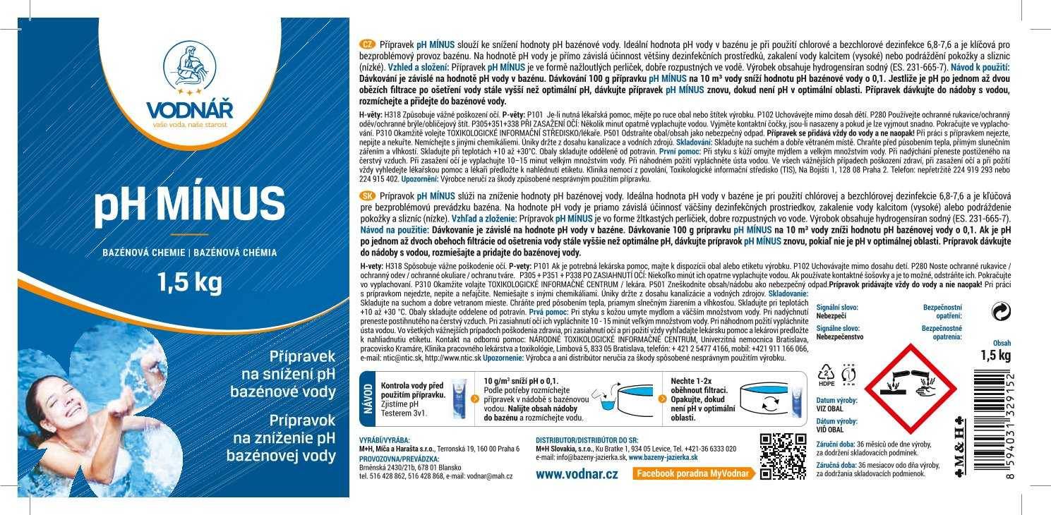 Vodnář pH minus BCH 1,5 kg je bazénový přípravek pro snadné a přesné snížení hodnoty pH bazénové vody. Je ve formě dobře rozpustných bílých až nažloutlých perliček, které se rychle rozpouštějí ve vodě a snižují její zásaditost. Správná úroveň pH je klíčová pro účinnost dezinfekce, pohodlí koupajících se a stabilitu ostatních parametrů vody.