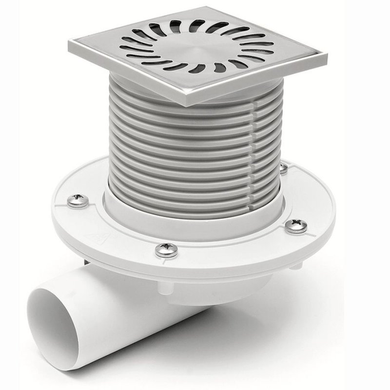 Podlahová vpusť boční s límcem a přírubou DN-50 mříž 150x150 nerez s vodní hladinou. Je určena k vnitřnímu použití.Zatížení K3-300kg,odolnost do 90C. Příruba slouží k vodotěsnému spojení hydroizolační fólie s podlahovou vpustí. Napojení na klasické HT hrdlové potrubí s těsněním.