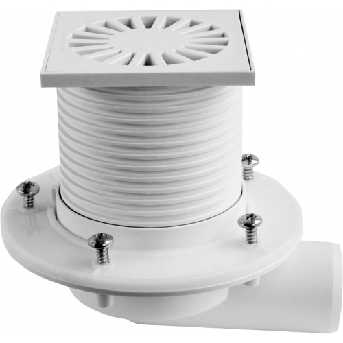 Podlahová vpusť boční s límcem a přírubou DN-50 mříž 100x100 plast s vodní hladinou. Je určena k vnitřnímu použití.Zatížení K3-300kg,odolnost do 90C. Příruba slouží k vodotěsnému spojení hydroizolační fólie s podlahovou vpustí. Napojení na klasické HT hrdlové potrubí s těsněním.